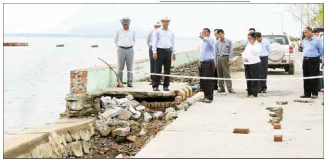 ထို့နောက် ဗိုလ်ချုပ်ကြီး တင်အောင်စန်းနှင့် အဖွဲ့သည် စစ်တွေမြို့ ကမ်းနားလမ်းသို့ ရောက်ရှိပြီး ကွန်ကရစ်လမ်း၊ ပလက်ဖောင်းနှင့် ကျောက်စီ မြေထိန်းနံရံများ ပျက်စီးနေမှုအား ဆောက်လုပ် ရေးဝန်ကြီးဌာန စစ်တွေခရိုင်လမ်းဦးစီးဌာနက ပြန်လည်ပြုပြင်ရန် ဆောင်ရွက်နေမှုအခြေ အနေကို ကြည့်ရှု စစ်ဆေးသည်။