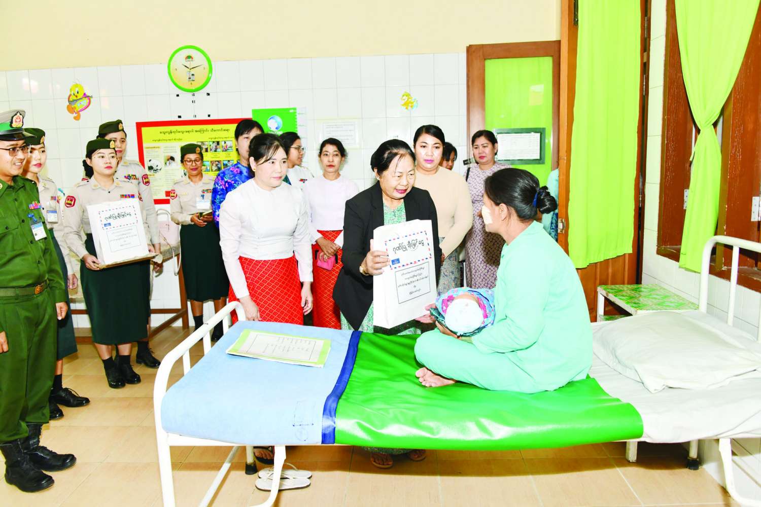 အလားတူ နိုင်ငံတော်စီမံအုပ်ချုပ်ရေးကောင်စီ ဒုတိယဥက္ကဋ္ဌ ဒုတိယတပ်မတော်ကာကွယ်ရေးဦးစီးချုပ် ကာကွယ်ရေးဦးစီးချုပ် (ကြည်း) ၏ ဇနီး ဒေါ်သန်းသန်းနွယ်နှင့် အဖွဲ့ဝင်များသည် အမျိုး သမီးနှင့် ကလေးကုသဆောင်သို့သွားရောက်၍ ဆေးရုံတက်ရောက် ကုသလျက်ရှိသည့် လူနာများအား လိုက်လံကြည့်ရှုအားပေးစကားပြောကြားပြီး စားသောက်ဖွယ်ရာများပေးအပ်သည်။