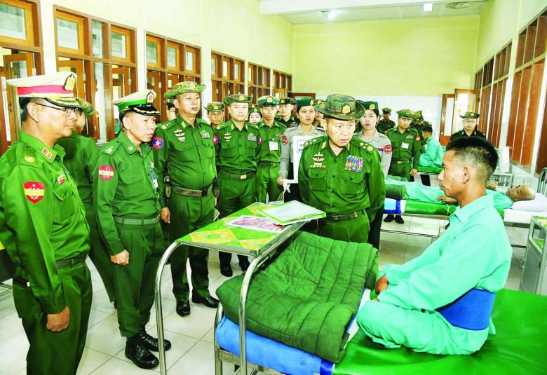 ယင်းနောက် နိုင်ငံတော်စီမံအုပ်ချုပ်ရေးကောင်စီဒုတိယဥက္ကဋ္ဌ ဒုတိယတပ်မတော်ကာကွယ်ရေးဦးစီးချုပ် ကာကွယ်ရေးဦးစီးချုပ် (ကြည်း) နှင့် အဖွဲ့ဝင်များသည် ဆေးရုံတက်ရောက်ကုသမှုခံယူလျက်ရှိသည့် နိုင်ငံတော်ကာကွယ်ရေးနှင့် လုံခြုံရေးတာဝန်များကိုထမ်းဆောင်စဉ် ထိခိုက်ဒဏ်ရာရရှိခဲ့ကြသည့် အရာရှိ၊ စစ်သည်များနှင့် ပြည်သူ့စစ် (ဌာနေ) တပ်ဖွဲ့ဝင်များ၏ ကျန်းမာရေး တိုးတက်ကောင်းမွန်လာမှုအခြေအနေများကို တစ်ဦးချင်း ရင်းရင်းနှီးနှီး မေးမြန်းအားပေးစကားပြောကြားကာ စားသောက်ဖွယ်ရာများ ပေးအပ်သည်။
