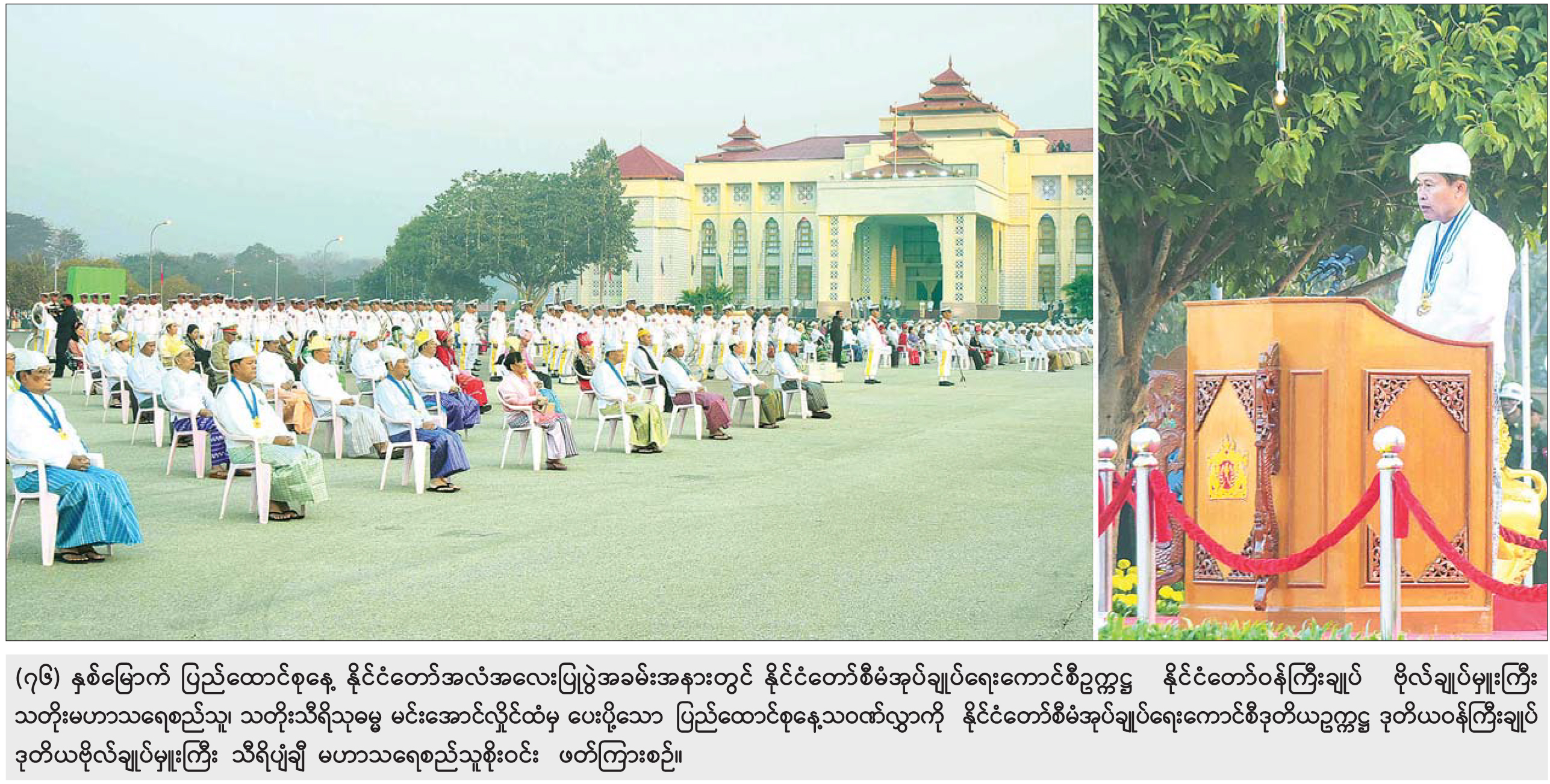 အခမ်းအနားသို့ ပြည်ထောင်စုဝန်ကြီးများ၊ ပြည်ထောင်စုစာရင်းစစ်ချုပ်၊ ပြည်ထောင်စု ရာထူးဝန်အဖွဲ့ဉက္ကဋ္ဌ၊ နေပြည်တော်ကောင်စီဥက္ကဋ္ဌ၊ တပ်မတော်အရာရှိကြီးများ၊ ပြည် ထောင်စု တရားလွှတ်တော်ချုပ် တရားသူကြီးများ၊ ဒုတိယဝန်ကြီးများ၊ ပြည်ထောင်စု ရာထူး ဝန်အဖွဲ့ဝင်များ၊ မြန်မာနိုင်ငံအမျိုးသား လူ့အခွင့်အရေးကော်မရှင်အဖွဲ့ဝင်များ၊ အဂတိ လိုက်စားမှုတိုက်ဖျက်ရေး ကော်မရှင်အဖွဲ့ဝင်များ၊ နေပြည်တော်ကောင်စီဝင်များ၊ ဌာနဆိုင်ရာ အကြီးအကဲများ၊ ဝန်ကြီးဌာနများမှဝန်ထမ်းများ၊ တိုင်းရင်းသားရိုးရာ ယဉ်ကျေးမှုအဖွဲ့များ၊ တိုင်းရင်းသား၊ တိုင်းရင်းသူကိုယ်စားလှယ်များနှင့် ဖိတ်ကြားထားသူများ တက်ရောက်ခဲ့ကြ ကြောင်း သတင်းရရှိသည်။