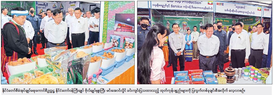 ယင်းနောက် နိုင်ငံတော်စီမံအုပ်ချုပ်ရေးကောင်စီဥက္ကဋ္ဌ နိုင်ငံတော်ဝန်ကြီးချုပ်သည် ခင်းကျင်းပြသထားသည့် ဒေသထွက်ကုန်ပစ္စည်းများ၊ စားသောက်ကုန်၊ လူသုံးကုန်၊ စက်မှုလက်မှုထုတ်ကုန်၊ ရိုးရာလက်မှုထုတ်ကုန်များ၊ အဝတ်အထည်များ စသည့် ထုတ်ကုန်ပစ္စည်းများ ခင်းကျင်းပြသထားရှိမှုများကို ပြကွက်တစ်ခုချင်းစီအလိုက် စိတ်ဝင်တစားဖြင့်လေ့လာခဲ့ပြီး ဈေးကွက်ရရှိမှုအခြေအနေများကို မေးမြန်း ဆွေးနွေးရာလုပ်ငန်းအလိုက် စီးပွားရေးလုပ်ငန်းရှင်များက လိုက်လံရှင်းလင်းတင်ပြခဲ့ကြောင်း သတင်းရရှိသည်။
