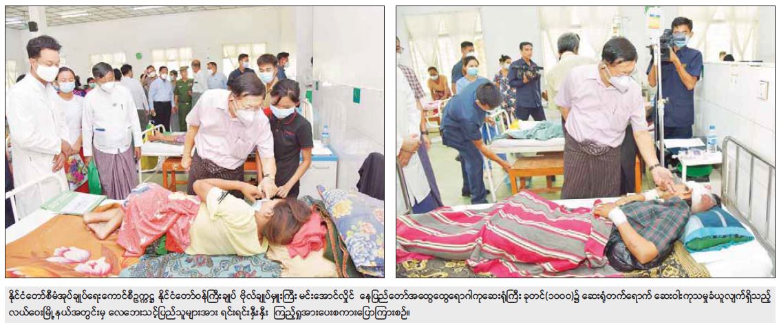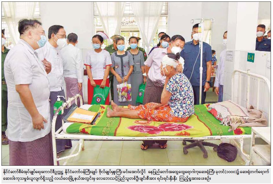 ထို့နောက် နိုင်ငံတော်စီမံအုပ်ချုပ်ရေးကောင်စီဥက္ကဋ္ဌ နိုင်ငံတော်ဝန်ကြီးချုပ်နှင့် အဖွဲ့ဝင်များသည် နေပြည်တော်အထွေထွေရောဂါကုဆေးရုံကြီး ခုတင် (၁၀၀၀) သို့ ရောက်ရှိကြပြီး ဆေးရုံတက်ရောက် ဆေးဝါးကုသမှုခံယူလျက်ရှိသည့် လေဘေးသင့်ပြည်သူများအား တစ်ဦးချင်း ရင်းရင်းနှီးနှီးအားပေးစကားပြောကြားကာ စားသောက်ဖွယ်ရာများ ထောက်ပံ့ပေးအပ်ပြီး လိုအပ်သည်များ ညှိနှိုင်းဆောင်ရွက်ပေးခဲ့ကြောင်း သတင်းရရှိသည်။