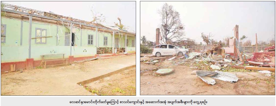 ထိုသို့ ကူညီကယ်ဆယ်ရေးဆောင်ရွက်နေမှုများနှင့် လေဘေးသင့်ပြည်သူများကို ယနေ့နံနက်ပိုင်းတွင် နိုင်ငံတော်စီမံအုပ်ချုပ်ရေးကောင်စီဥက္ကဋ္ဌ နိုင်ငံတော်ဝန်ကြီးချုပ် ဗိုလ်ချုပ်မှူးကြီးမင်းအောင်လှိုင်သည် ကောင်စီအတွင်းရေးမှူး ဒုတိယဗိုလ်ချုပ်ကြီး အောင်လင်းဒွေး၊ ပြည်ထောင်စုဝန်ကြီးများ၊ နေပြည်တော်ကောင်စီဥက္ကဋ္ဌ၊ ကာကွယ် ရေးဦးစီးချုပ်ရုံးမှ တပ်မတော်အရာရှိကြီးများ၊ နေပြည်တော်တိုင်းစစ်ဌာနချုပ် တိုင်းမှူးနှင့်တာဝန်ရှိသူများလိုက်ပါ၍ သွားရောက်ကြည့်ရှုအားပေးသည်။