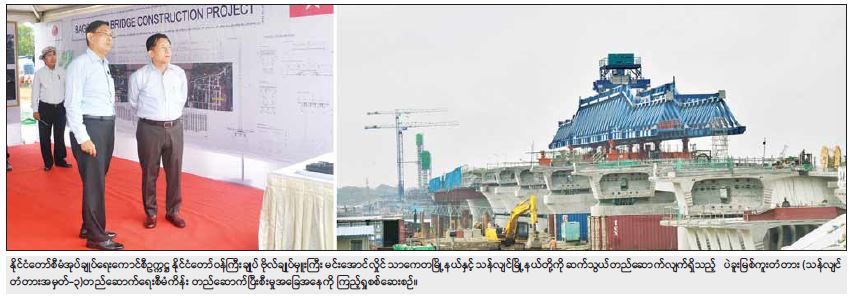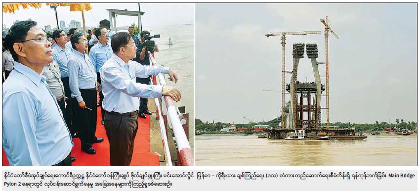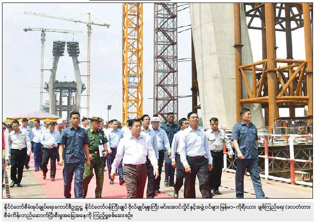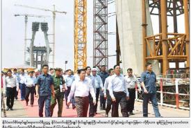 ယင်းနောက် နိုင်ငံတော်စီမံအုပ်ချုပ်ရေးကောင်စီဥက္ကဋ္ဌ နိုင်ငံတော်ဝန်ကြီးချုပ်နှင့် အဖွဲ့ဝင်များသည် တံတားတည်ဆောက်ရေးစီမံကိန်းရှိ ရန်ကုန်ဘက်ခြမ်း Main Bridge Pylon 2 နေရာတွင် လုပ်ငန်းဆောင်ရွက်နေမှု အခြေအနေများကို လိုက်လံ ကြည့်ရှု စစ်ဆေးရာ တာဝန်ရှိသူများ၏  ရှင်းလင်းတင်ပြမှုများအပေါ် လိုအပ်သည်များ လမ်းညွှန်မှာကြားသည်။