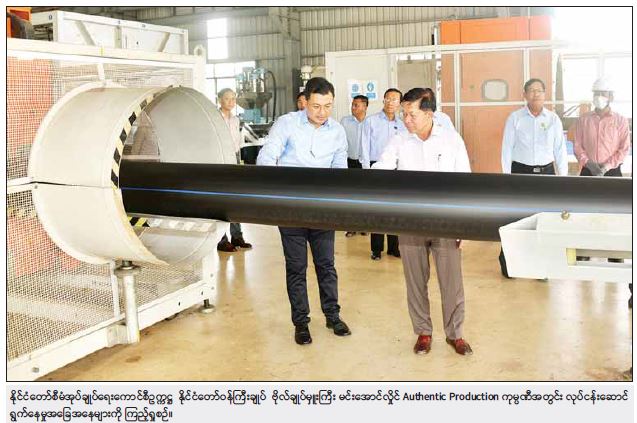 ဆက်လက်ပြီး နိုင်ငံတော်စီမံအုပ်ချုပ်ရေးကောင်စီဥက္ကဋ္ဌ နိုင်ငံတော်ဝန်ကြီးချုပ်နှင့် အဖွဲ့ဝင်များသည် ရန်ကုန်တိုင်းဒေသကြီး၊ မင်္ဂလာဒုံမြို့နယ်ရှိ Authentic Production Co.ltd သို့ ရောက်ရှိရာ ကုမ္ပဏီမှ မန်နေဂျင်းဒါရိုက်တာ ဦးအောင်မျိုးဟိန်းနှင့် တာဝန်ရှိသူများက ကြိုဆိုနှုတ်ဆက်ကြသည်။ ထို့နောက် ကုမ္ပဏီအစည်းအဝေးခန်းမတွင် ဦးအောင်မျိုးဟိန်းက ကုမ္ပဏီသမိုင်းအကျဉ်းနှင့် စက်ရုံမှ HDPE၊ DWC၊ PVC စသည့် ပိုက်မျိုးမျိုးကို ဆိုဒ်မျိုးစုံ ထုတ်လုပ်၍ ပြည်တွင်း၊ ပြည်ပသို့ဖြန့်ဖြူးလျက်ရှိမှု၊ ရေတိုင်ကီများ၊ မိလ္လာကန်များ၊ Road Block များ၊ ဟိုတယ်သုံး အညစ်အကြေးစစ်ထုတ်သည့် ပစ္စည်း၊ ပိုက်ဆက်ပစ္စည်းများကို ထုတ်လုပ်ဖြန့်ဖြူးလျက်ရှိမှု၊ ကုမ္ပဏီမှ ထုတ်လုပ်သည့် ပိုက်လိုင်းများကို စီမံကိန်းအသီးသီးတွင် အသုံးပြုလျက်ရှိမှုနှင့် ဆက်လက်ဆောင်ရွက်သွားမည့် အခြေအနေများကို ရှင်းလင်းတင်ပြသည်။