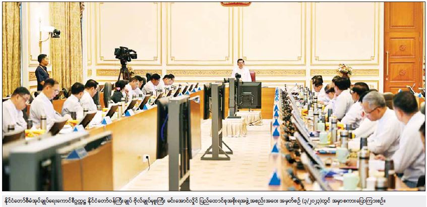 ပြည်ထောင်စုအစိုးရအဖွဲ့အစည်းအဝေး အမှတ်စဉ် (၃/၂၀၂၃)ကို ယနေ့မွန်းလွဲပိုင်းတွင် နေပြည်တော်ရှိ နိုင်ငံတော်စီမံအုပ်ချုပ်ရေးကောင်စီဥက္ကဋ္ဌရုံး အစည်းအဝေးခန်းမ၌ကျင်းပရာ နိုင်ငံတော်စီမံအုပ်ချုပ်ရေးကောင်စီဥက္ကဋ္ဌ နိုင်ငံတော်ဝန်ကြီးချုပ် ဗိုလ်ချုပ်မှူးကြီး မင်းအောင်လှိုင် တက်ရောက်အမှာစကား ပြောကြားသည်။