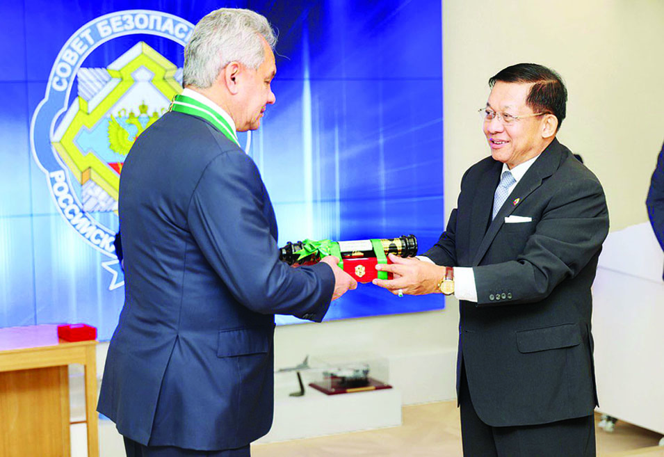 ထို့နောက် နိုင်ငံတော်စီမံအုပ်ချုပ်ရေးကောင်စီ ဥက္ကဋ္ဌ နိုင်ငံတော်ဝန်ကြီးချုပ် ဗိုလ်ချုပ်မှူးကြီး မင်းအောင်လှိုင်သည် ရုရှားဖက်ဒရေးရှင်းနိုင်ငံ လုံခြုံရေးကောင်စီ အတွင်းရေးမှူး Mr. Sergey Kuzhugetovich Shoigu အား ပြည်ထောင်စုစည်သူသင်္ဂဟဘွဲ့၊ စည်သူဘွဲ့ကို ချီးမြှင့်အပ်နှင်းခဲ့သည်။