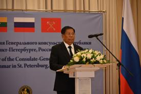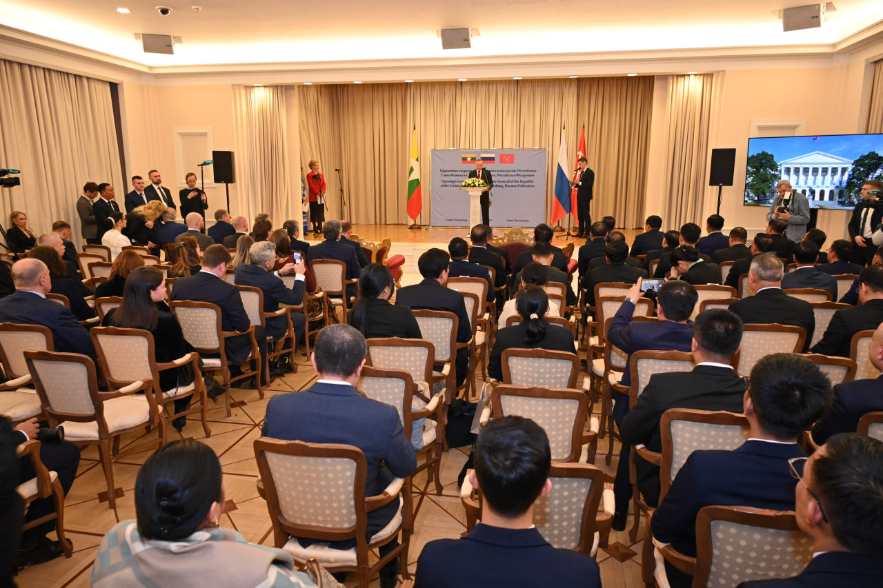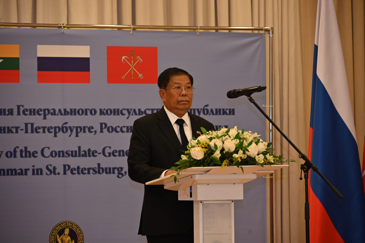 ထို့နောက် စိန့်ပီတာစဘတ်မြို့အုပ်ချုပ်ရေးမှူး မစ္စတာအလက်ဇန္ဒား ဘယ်ဂ်လော့က အဖွင့်နှုတ်ခွန်းဆက်စကားပြောကြားရာတွင် ရုရှား-မြန်မာဆက်ဆံရေးများ ကောင်းမွန်လျက်ရှိခြင်းကြောင့် မိမိတို့ရုရှားနိုင်ငံ စိန့်ပီတာစဘတ်မြို့တွင် မြန်မာကောင်စစ်ဝန်ချုပ်ရုံးကို ဖွင့်လှစ်နိုင်ခဲ့ခြင်းဖြစ်ကြောင်း၊ ယခုကဲ့သို့ ကောင်စစ်ဝန်ချုပ် ရုံးအား ဖွင့်လှစ်နိုင်ခဲ့ခြင်းကြောင့် နှစ်နိုင်ငံအကြား ဆက်ဆံရေးကိုပိုမိုတိုးတက် ကောင်းမွန်လာစေမည်ဖြစ်ပါကြောင်း၊ မြန်မာကောင်စစ်ဝန်ချုပ်ရုံး ဖွင့်လှစ်နိုင်ရေးအတွက် အမြန်ဆုံးဆောင်ရွက်ပေးခဲ့သည့် နိုင်ငံတော်စီမံအုပ်ချုပ်ရေးကောင်စီ ဥက္ကဋ္ဌ နိုင်ငံတော်ဝန်ကြီးချုပ်ကိုလည်း ကျေးဇူးတင်ရှိပါကြောင်း၊ ရုရှား-မြန်မာ နှစ်နိုင်ငံအကြား ကောင်စစ်ဝန်ချုပ်ရုံးသည် ပေါင်းကူးတံတားတစ်ခုသဖွယ်ဖြစ်သဖြင့် နှစ်နိုင်ငံအတွက် များစွာအကျိုးရှိပါကြောင်းဖြင့်ပြောကြားသည်။