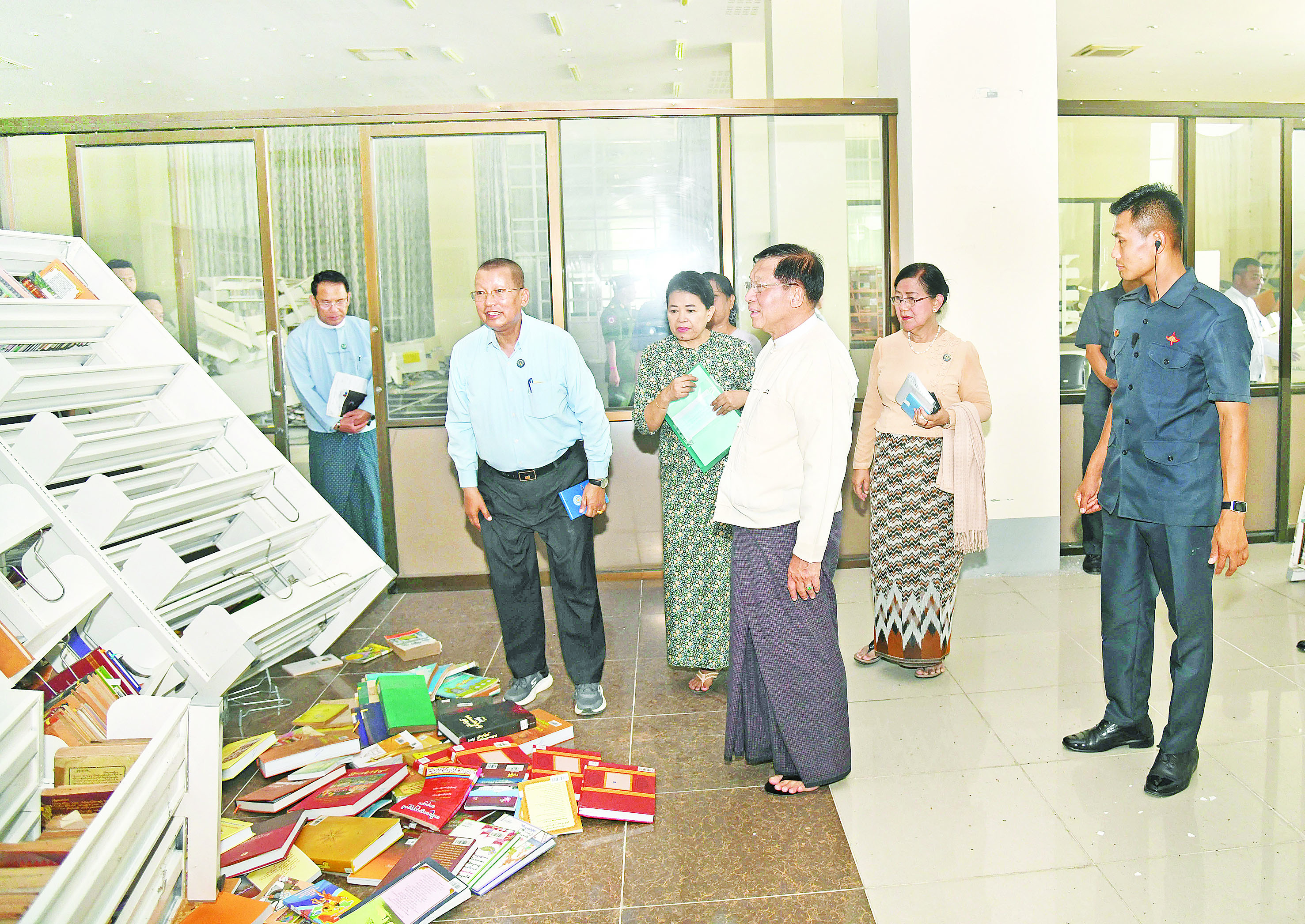 ဦးစွာ နိုင်ငံတော်စီမံအုပ်ချုပ်ရေးကောင်စီဥက္ကဋ္ဌ နိုင်ငံတော်ဝန်ကြီးချုပ်နှင့် အဖွဲ့ဝင်များသည် အမျိုးသားစာကြည့်တိုက်(နေပြည်တော်)အဆောက်အအုံနှင့် အဆောက်အအုံအတွင်းရှိ အလင်္ကာ ကျော်စွာစည်သူ တက္ကသိုလ်မြတ်သူ စာစုများထားရှိသည့်အခန်း၊ အီလက်ထရွန်နစ်စာကြည့်တိုက်နှင့် စာဖတ်ခန်း၊ ဝန်ဇင်းမင်းရာဇာခန်းမ၊ စာအုပ်စင်ခန်းများ၊ ပေ၊ ပုရပိုက်ဌာနစိတ်နှင့် စာကြည့်တိုက် အတွင်း ထိခိုက်ပျက်စီးခဲ့မှုများ၊ စာအုပ်များကို အမျိုးအစားအလိုက် ထိန်းသိမ်းထားရှိမှုများကို လိုက်လံကြည့်ရှုစစ်ဆေးရာ သာသနာရေးနှင့် ယဉ်ကျေးမှုဝန်ကြီးဌာန ပြည်ထောင်စုဝန်ကြီးနှင့် တာဝန်ရှိသူများက ထိခိုက်ပျက်စီးခဲ့မှုအခြေအနေများကို ရှင်းလင်း တင်ပြကြသည်။