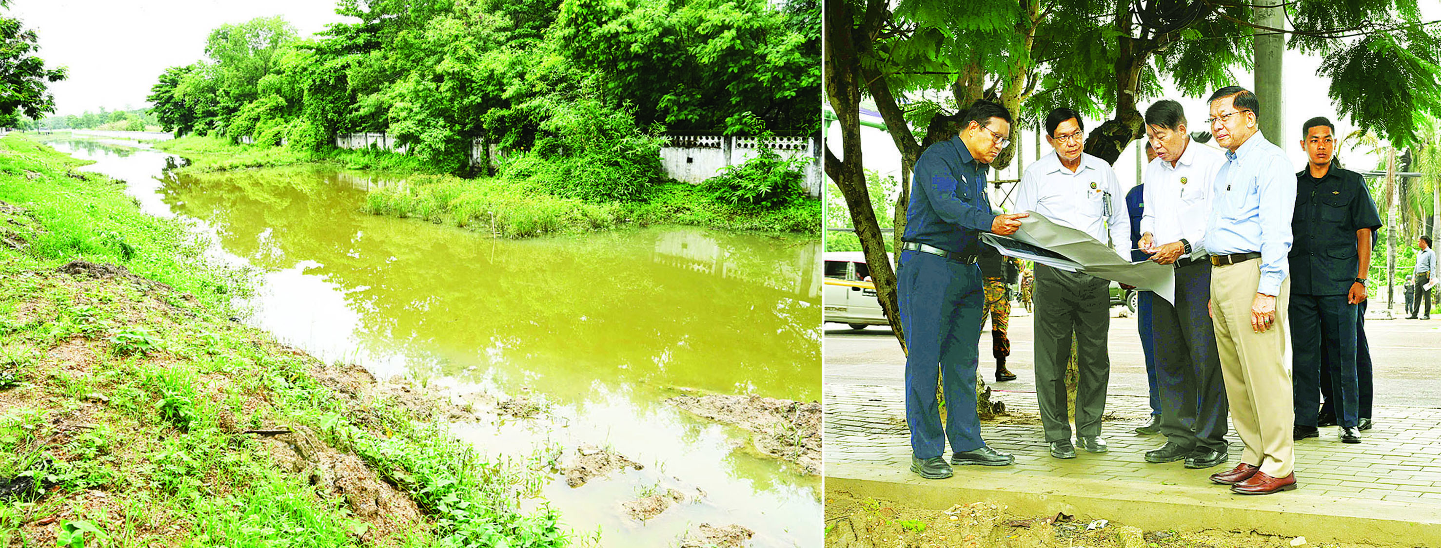ဦးစွာ နိုင်ငံတော်စီမံအုပ်ချုပ်ရေးကောင်စီဥက္ကဋ္ဌ နိုင်ငံတော်ဝန်ကြီးချုပ်နှင့် အဖွဲ့ဝင်များသည် လှိုင်သာယာမြို့နယ် ရန်ကုန် - ပုသိမ် လမ်းမပေါ်ရှိ ဘုရင့်နောင်တံတားအဆင်းအနီး ယောအတွင်းဝန် ဦးဖိုးလှိုင်လမ်းထိပ်သို့ရောက်ရှိပြီး လူသွားစင်္ကြံအသစ် ခင်းကျင်းဆောင်ရွက်ထားရှိမှုနှင့် လမ်းဘေး ဝဲယာ၌ ရေနုတ်မြောင်းအဆင့်မြှင့်တင်ထားရှိမှုတို့ကို ကြည့်ရှုစစ်ဆေးပြီး တာဝန်ရှိသူများ၏ တင်ပြချက်များအပေါ် လှိုင်သာယာမြို့နယ်အတွင်း ရေစီးရေလာ ကောင်းမွန်စေရေးအတွက် ရေနုတ်မြောင်းများအားနုန်းများ ဆယ်တင်ခြင်းနှင့် ချောင်းဖြောင့်ခြင်းလုပ်ငန်းများကို ဆက်လက် ဆောင်ရွက်သွားရန်လိုကြောင်း၊ အချို့နေရာများ၌ ရေများစီးဆင်းမှုမရှိဘဲ ပိတ်ဆို့လျက်ရှိသဖြင့် အလွယ်တကူစီးဆင်းသွားနိုင်မည့်ပုံစံနှင့် ရေမြောင်း level တို့ကို စနစ်တကျဖြင့် သုတေသနပြု ဆောင်ရွက်သွားရန်လိုကြောင်း၊ ယခု ရန်ကုန် - ပုသိမ် လမ်းမကြီးသည် အသွားအလာများသည့် ပင်မလမ်းမကြီးဖြစ်သဖြင့် လမ်းဘေးဝဲယာတစ်လျှောက် သန့်ရှင်းသပ်ရပ်မှုရှိစေရေး၊ ရေစီးရေလာ ကောင်းမွန်ရေးကို ဖော်ဆောင်ကာ လှိုင်သာယာမြို့နယ်၏ သန့်ရှင်း သာယာလှပမှုနှင့် စည်းကမ်း စနစ်တကျရှိမှုတို့ကိုပြသ၍ ဂုဏ်ယူကြရန်လိုကြောင်းနှင့် အခြားလိုအပ်သည်များ လမ်းညွှန် မှာကြားသည်။