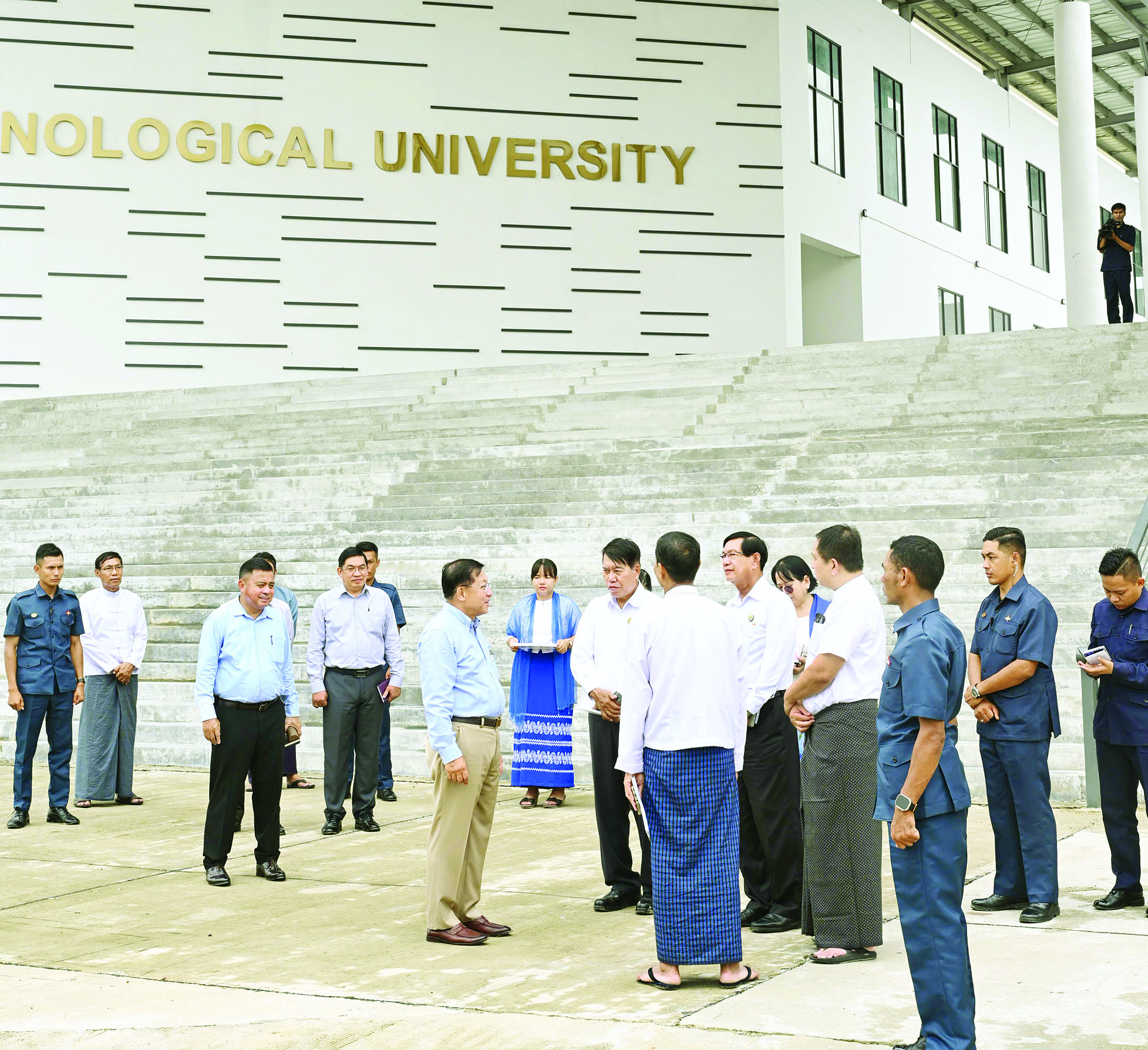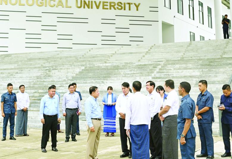 ဆက်လက်၍ နိုင်ငံတော်စီမံအုပ်ချုပ်ရေးကောင်စီ ဥက္ကဋ္ဌ နိုင်ငံတော်ဝန်ကြီးချုပ်နှင့်အဖွဲ့ဝင်များသည် ရန်ကုန်အနောက်ပိုင်း နည်းပညာတက္ကသိုလ်သို့ ရောက်ရှိကြပြီး တက္ကသိုလ်အဝင်လမ်းမကြီးနှင့် လူသွားစင်္ကြံ ခင်းကျင်းထားရှိမှုအခြေအနေများ၊ အဝင်လမ်းတစ်လျှောက် သစ်ပင်ပန်းမန် စိုက်ပျိုးထားရှိမှုများကို ကြည့်ရှုစစ်ဆေးပြီး တာဝန်ရှိသူများ၏ တင်ပြချက်များအပေါ် လိုအပ်သည်များ လမ်းညွှန် မှာကြားသည်။