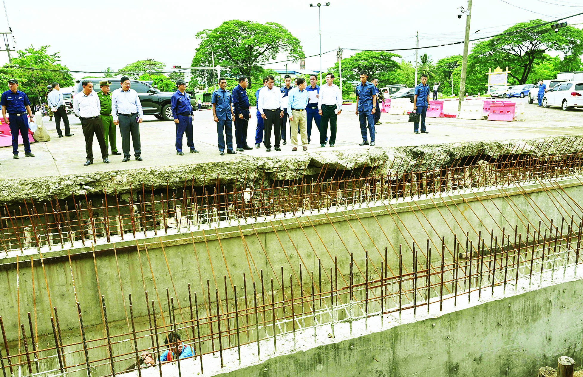 ယင်းနောက် ညောင်တုန်းလမ်းအတိုင်း မော်တော်ယာဉ်များဖြင့် လှည့်လည်၍ အောင်ဇေယျတံတား အနီး၌ တပင်ရွှေထီးလမ်းဖြတ်ကူးတံတား တည်ဆောက်မှု လုပ်ငန်းခွင်သို့ရောက်ရှိကြပြီး လုပ်ငန်း ဆောင်ရွက်နေမှုအခြေအနေများအား ရှင်းလင်းတင်ပြမှုများအပေါ် လိုအပ်သည်များ လမ်းညွှန် မှာကြားသည်။