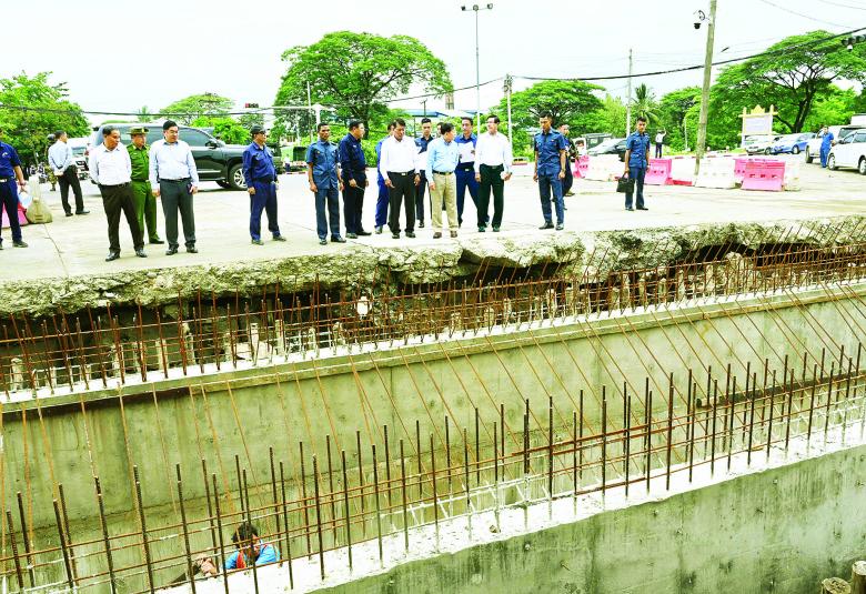 ထို့နောက် ရန်ကုန် - ပုသိမ်လမ်းမပေါ်ရှိ ကနောင်မင်းသားကြီး လမ်းထိပ်နေရာ၌ တောင်ဘက်ခြမ်း၊ လမ်းဖြတ်ကူးတံတား ဆောင်ရွက်ပြီးစီးမှုအခြေ အနေများ၊ လူသွားစင်္ကြံအသစ် ခင်းကျင်းထားရှိမှု အခြေအနေများ၊ ရေစီးရေလာကောင်းမွန်ရေးဆောင်ရွက်ထားရှိမှု အခြေအနေများကို ကြည့်ရှု စစ်ဆေးကာ တာဝန်ရှိသူများ၏ တင်ပြချက်များအပေါ် လူသွားစင်္ကြံ ခင်းကျင်းထားရှိမှုမှာ ကောင်းမွန်ပြီး လူသွားစင်္ကြံပေါ်၌ တည်ရှိနေသည့် လျှပ်စစ်ဓာတ်အားပေးတိုင်များကို စင်္ကြံဧရိယာ ပြင်ပသို့ ရွှေ့ပြောင်းသွားရန်နှင့် ရေနုတ်မြောင်းများအတွင်း ရေစီးရေလာကောင်းမွန်ရေးတို့အတွက် လိုအပ်သည်များကို လမ်းညွှန်မှာကြားသည်။