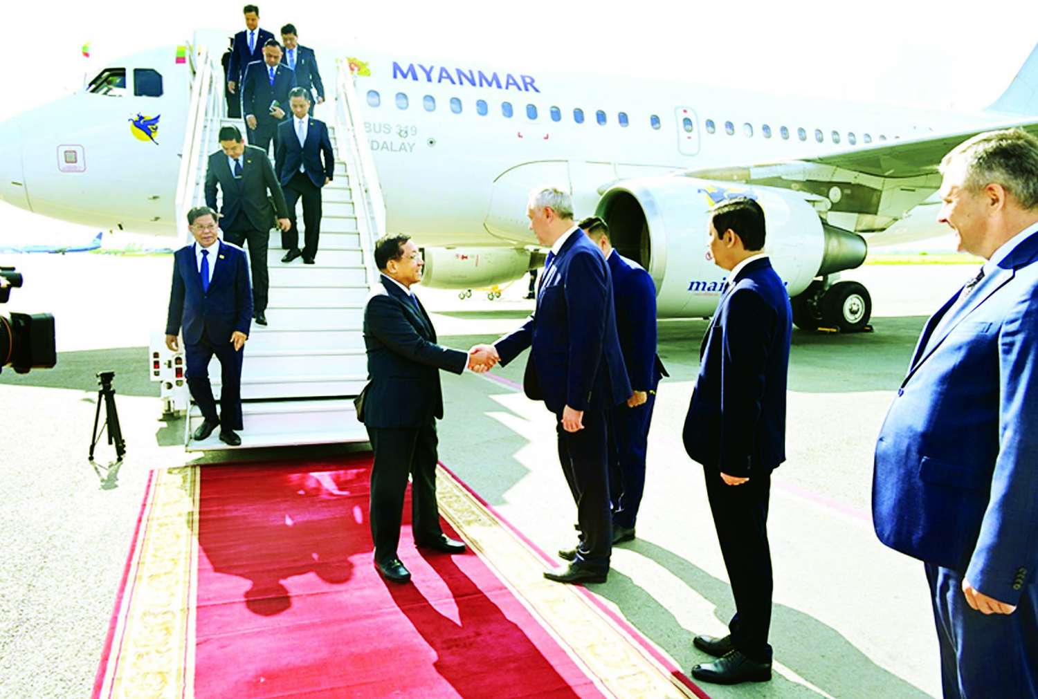 EAEU ၏ အလှည့်ကျဥက္ကဋ္ဌဖြစ်သည့် ဘယ်လာရုစ်သမ္မတ နိုင်ငံသမ္မတ H.E. Mr. Alexander Grigoryevich Lukashenko ၏ ဖိတ်ကြားချက်အရ မင့်စ်မြို့၌ ကျင်းပပြုလုပ်မည့် စတုတ္ထအကြိမ် ဥရောပ-အာရှ စီးပွားရေးဖိုရမ် (EEF 2025)သို့ တက်ရောက်ရန်အတွက် နိုင်ငံတော်စီမံအုပ်ချုပ်ရေးကောင်စီဥက္ကဋ္ဌ နိုင်ငံတော်ဝန်ကြီးချုပ် ဗိုလ်ချုပ်မှူးကြီးမင်းအောင်လှိုင် ဦးဆောင်သည့် မြန်မာအဆင့်မြင့် ကိုယ်စားလှယ် အဖွဲ့သည် ယနေ့နံနက်ပိုင်းတွင် မြန်မာနိုင်ငံမှ အထူးလေယာဉ်ဖြင့် ထွက်ခွာခဲ့ပြီး ညနေပိုင်းတွင် နိုဗာစီဗစ်မြို့ သာမာရှယ်ဗာလေဆိပ်သို့ရောက်ရှိရာ နိုဗာစီဗစ်ဒေသအုပ်ချုပ်ရေးမှူး Mr. Travnikov Ahdrey Aleksandrovich နှင့် တာဝန်ရှိသူများက လေဆိပ်၌ လှိုက်လှဲနွေးထွေးစွာ ကြိုဆိုနှုတ်ဆက်သည်။