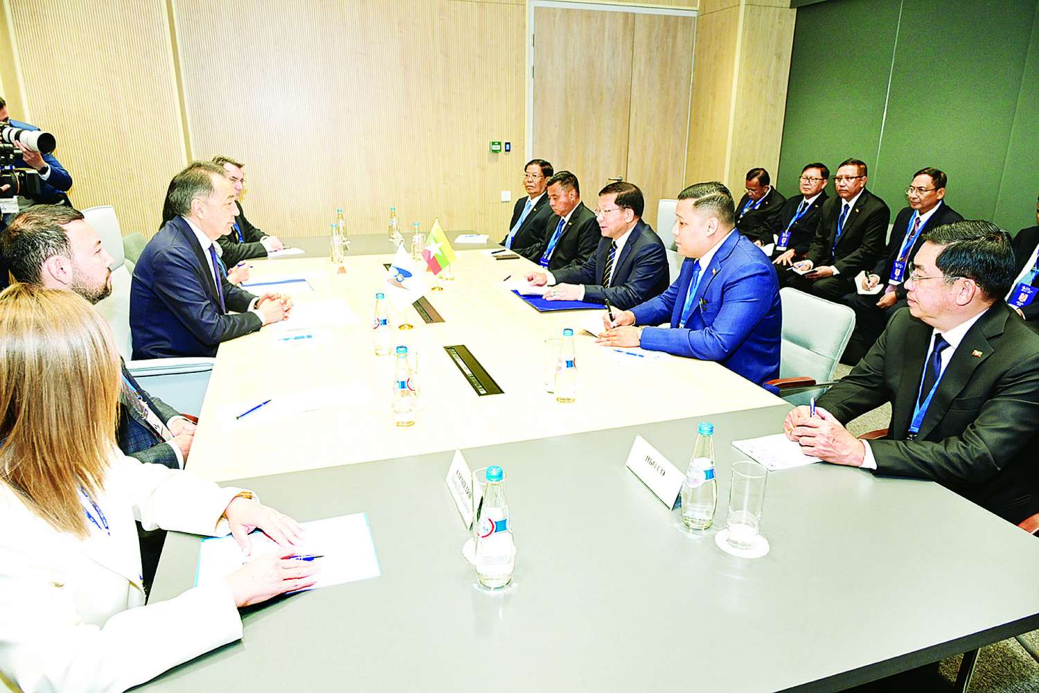 ယင်းနောက် နိုင်ငံတော်စီမံအုပ်ချုပ်ရေးကောင်စီဥက္ကဋ္ဌ နိုင်ငံတော်ဝန်ကြီးချုပ်က ယခုတွေ့ဆုံဆွေးနွေးမှုမှ တဆင့် မိမိတို့မြန်မာနိုင်ငံနှင့် ဥရောပ-အာရှ စီးပွားရေးသမဂ္ဂ (EAEU) အဖွဲ့ဝင်နိုင်ငံများအကြား ပူးပေါင်း ဆောင်ရွက်မှုများကို လက်တွေ့အကောင်အထည်ဖော်ဆောင်ရွက်နိုင်ရန် တွန်းအားဖြစ်စေမည်ဟု ယုံကြည်ကြောင်း၊ မြန်မာနိုင်ငံနှင့် ဥရောပ-အာရှ စီးပွားရေးသမဂ္ဂ (EAEU) တို့အကြား ၂၀၂၃ ခုနှစ်တွင် ပူးပေါင်းဆောင်ရွက်မှုစာချွန်လွှာ လက်မှတ်ရေးထိုးခဲ့ပြီးဖြစ်ကြောင်း၊ ထို့ပြင် ၂၀၂၃ ခုနှစ်၊ ဇွန်လတွင် ရုရှားဖက်ဒရေးရှင်းနိုင်ငံ၊ စိန့်ပီတာစဘတ်မြို့၌ ပြည်ထောင်စုသမ္မတမြန်မာ နိုင်ငံတော်အစိုးရနှင့် ဥရောပ-အာရှစီးပွားရေးကော်မရှင် (EEC) တို့အကြား ပူးပေါင်းဆောင်ရွက်မှုစာချွန်လွှာ (Memorandum of Cooperation-MOC) အား လက်မှတ်ရေးထိုးနိုင်ခဲ့ကြောင်း၊ မြန်မာနိုင်ငံနှင့် (EAEU) အဖွဲ့ဝင်နိုင်ငံများအကြား ပူးပေါင်းဆောင်ရွက်နိုင်မည့် အခွင့်အလမ်းများစွာကိုလည်း လေ့လာတွေ့ရှိရပါကြောင်း၊ လက်မှတ်ရေးထိုးထား သည့် ပူးပေါင်းဆောင်ရွက်မှုစာချွန်လွှာအား အကောင်အထည်ဖော်ဆောင်ရွက်ခြင်းမှတဆင့် ဥရောပ-အာရှ စီးပွားရေးသမဂ္ဂ (EAEU) ၏ လေ့လာသူနိုင်ငံအဆင့်အထိ တက်လှမ်းနိုင်မည်ဟုလည်း ယုံကြည်မျှော်လင့် ထားကြောင်း၊ မြန်မာနိုင်ငံအနေဖြင့် လက်တွေ့အကောင်အထည်ဖော်ဆောင်ရွက်မှုများဖြင့် ပူးပေါင်း ဆောင်ရွက်မှုကို ပိုမိုခိုင်မာကျယ်ပြန့်စေရေးဆောင်ရွက်သွားမည် ဖြစ်ကြောင်းဖြင့် ပြန်လည်ဆွေးနွေး ပြောကြားသည်။