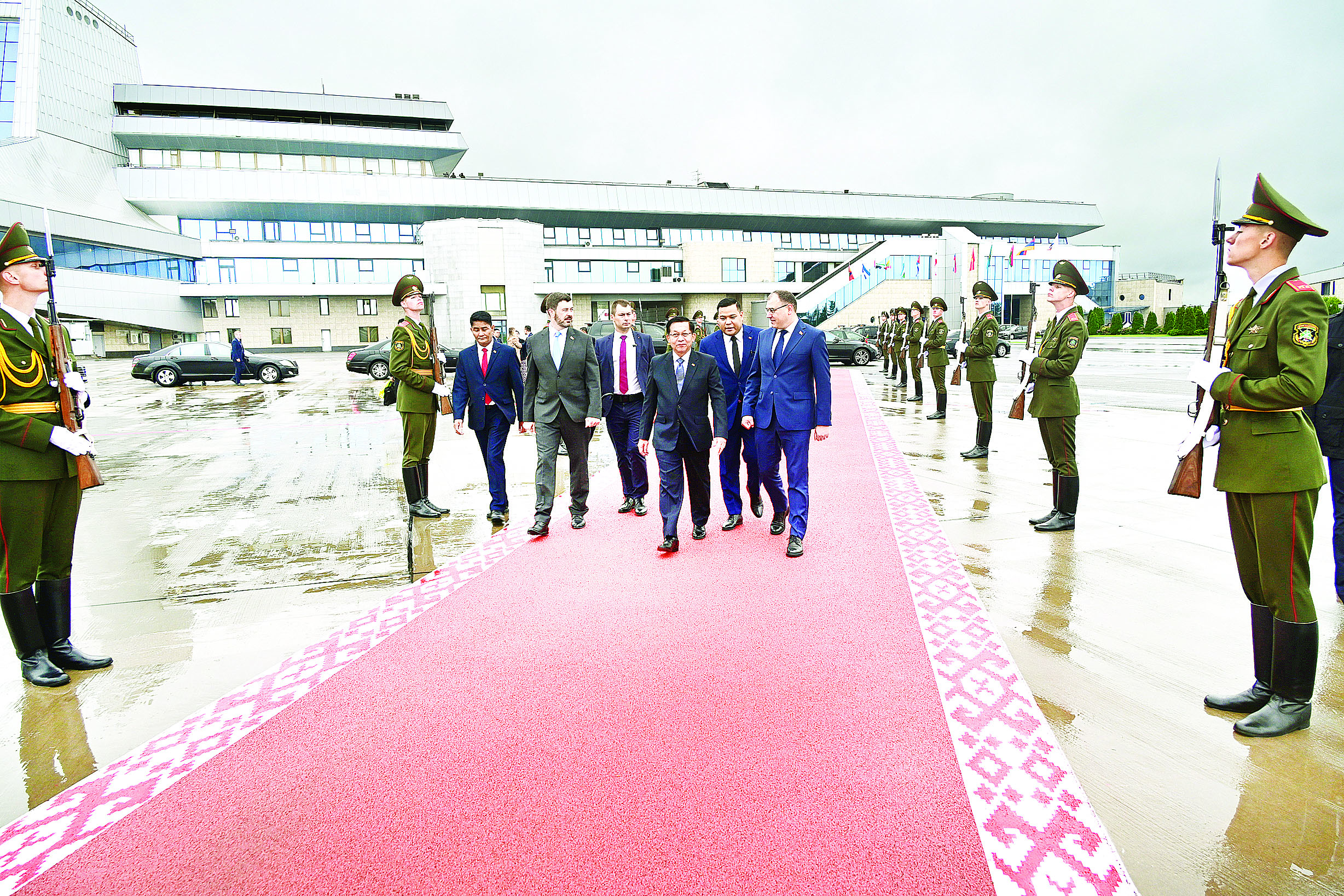 နိုင်ငံတော်စီမံအုပ်ချုပ်ရေးကောင်စီဥက္ကဋ္ဌ နိုင်ငံတော်ဝန်ကြီးချုပ် ဦးဆောင်သည့် မြန်မာအဆင့်မြင့် ကိုယ်စားလှယ်အဖွဲ့အား မင့်စ်မြို့ အပြည်ပြည်ဆိုင်ရာလေဆိပ်တွင် ဘယ်လာရုစ်သမ္မတနိုင်ငံ ဒုတိယ ဝန်ကြီးချုပ် Mr. Yuri Shuleiko နှင့် နိုင်ငံခြားရေးဝန်ကြီးဌာနမှ ဒုတိယ ဝန်ကြီး(၁) Mr. Lukashevich Sergey Vladimirovich ၊ ဘယ်လာရုစ် သမ္မတနိုင်ငံဆိုင်ရာ မြန်မာကောင်စစ်ဝန်ချုပ် ဦးမိုးကျော်သူနှင့် တာဝန် ရှိသူများက ပို့ဆောင်နှုတ်ဆက်ကြသည်။