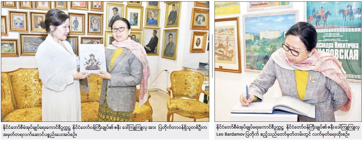 ဦးစွာ နိုင်ငံတော်စီမံအုပ်ချုပ်ရေးကောင်စီဥက္ကဋ္ဌ နိုင်ငံတော်ဝန်ကြီး ချုပ်၏ဇနီး ဦးဆောင်သော ကိုယ်စားလှယ်အဖွဲ့အား Buryatia ပြည်နယ် ဒုတိယအကြီးအကဲ Ms. Evgenia Yurievna Ludupova နှင့် Leo Bardamov ပြတိုက်မှ တာဝန်ရှိသူများက ကြိုဆိုနှုတ်ဆက်ကြသည်။