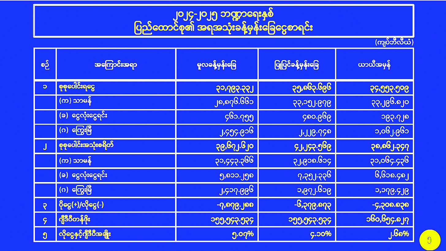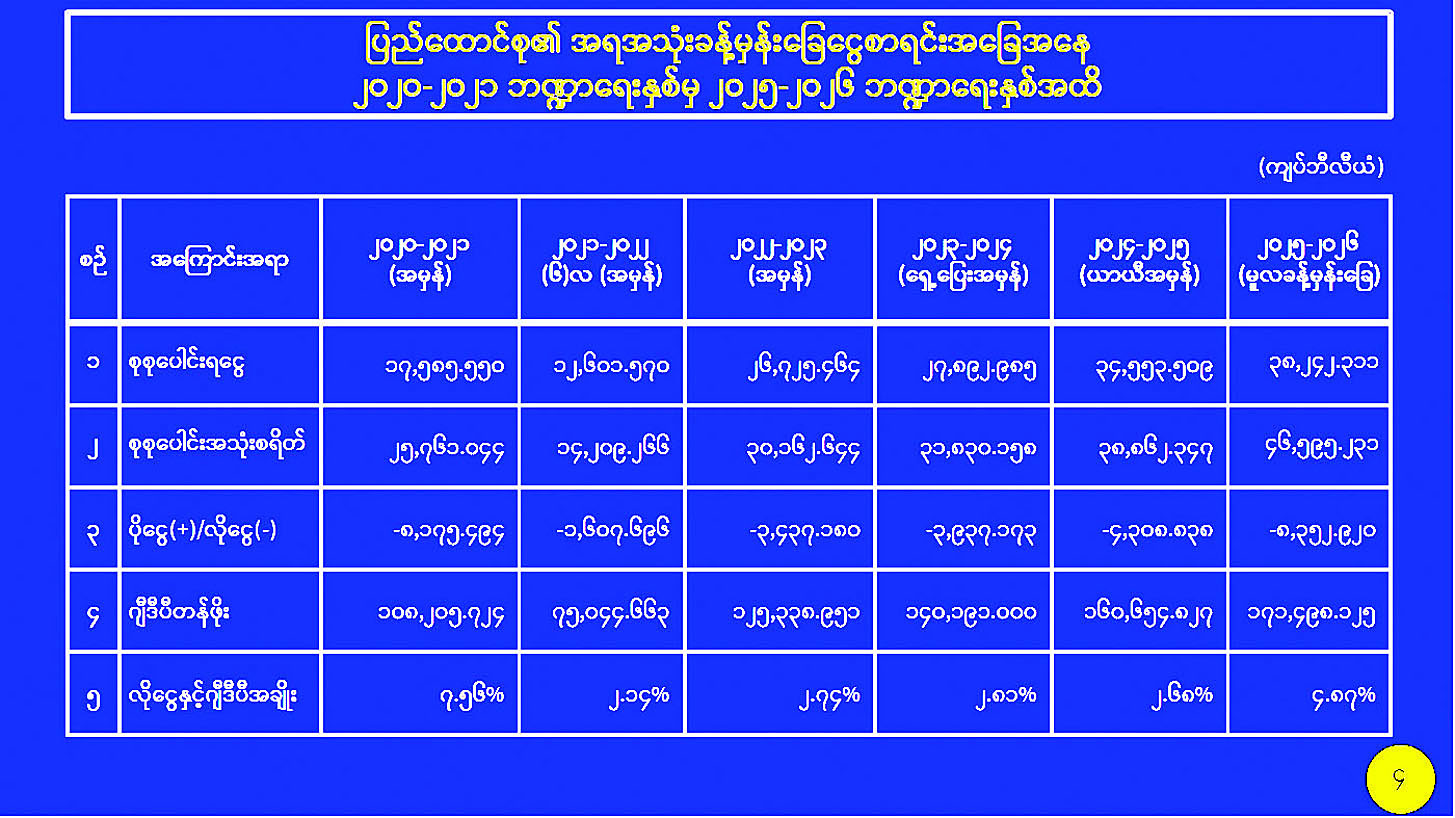 နိုင်ငံတစ်ခု၏ စီးပွားရေးကို GDP ဖြင့်တိုင်းတာကြကြောင်း၊ ၂၀၂၄ -၂၀၂၅ ခုနှစ် ဘဏ္ဍာနှစ်တွင် မိမိတို့နိုင်ငံ၏ GDP မှာ အမေရိကန်ဒေါ်လာ ၇၆ ဒသမ ၄ ဘီလီယံရှိကြောင်း၊ ၂၀၂၅-၂၀၂၆ ဘဏ္ဍာနှစ်တွင် အမေရိကန်ဒေါ်လာ ၈၁ ဒမသ ၆ ဘီလီယံအထိ မျှော်မှန်းဆောင်ရွက်လျက်ရှိပြီး ၅ ဒသမ ၂ ဘီလီယံခန့် တိုးတက်အောင် ရည်မှန်းဆောင်ရွက်နေခြင်းဖြစ်ကြောင်း၊ ထိုသို့မိမိတို့အနေဖြင့် မျှော်မှန်းဆောင်ရွက်နေချိန်တွင် ကမ္ဘာ့ဘဏ်မှ မိမိတို့နိုင်ငံ၏ စီးပွားရေးကို ယခင်က ၂ ဒသမ ၅ အထိ မျှော်မှန်းထားသော်လည်း လက်ရှိအချိန်တွင် အနုတ် ၂ ဒသမ ၅ အထိကျဆင်းနိုင်သည်ဟု ခန့်မှန်းထားသည်ကိုတွေ့ရှိရကြောင်း၊ ၎င်းတို့ တွက်ချက်သည့်စာရင်းများတွင် အချက်အလက်များ မှန်ကန်မှုမရှိခြင်းနှင့် ပြည့်စုံမှုမရှိခြင်းများရှိသည်ကိုတွေ့ရှိရကြောင်း၊ မိမိတို့နိုင်ငံအတွက် အရေးကြီး သည်မှာ အမှန်တကယ်အလုပ်လုပ်ရန်လိုကြောင်း၊ မည်သို့ပင် နိုင်ငံ၏ GDP ကျဆင်းမည်ဟု ၎င်းတို့အနေဖြင့် မျှော်မှန်းထားသော်လည်း နိုင်ငံအတွင်းနေထိုင်သူများက ကြိုးပမ်းဆောင်ရွက်ပါက နိုင်ငံ၏ GDP မှာတိုးတက်လာမည်ဖြစ်ကြောင်း။