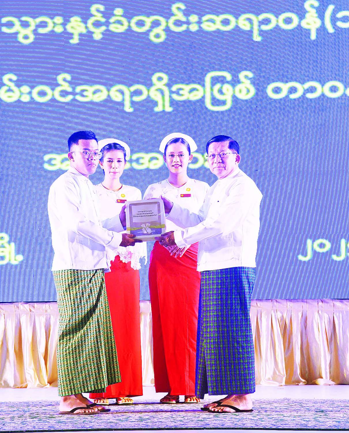 ၎င်းနောက် နိုင်ငံတော်စီမံအုပ်ချုပ်ရေးကောင်စီဥက္ကဋ္ဌ နိုင်ငံတော်ဝန်ကြီးချုပ်က ဖျော်ဖြေတင်ဆက်ခဲ့ကြသည့် ကျောင်းသား၊ ကျောင်းသူများနှင့် ဝန်ထမ်းများအား ဂုဏ်ပြုသစ်သီးခြင်းနှင့် ချီးမြှင့်ငွေများပေးအပ်သည်။
