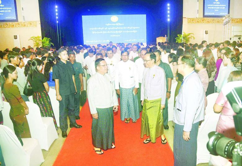 နိုင်ငံတော်စီမံအုပ်ချုပ်ရေးကောင်စီဥက္ကဋ္ဌ နိုင်ငံတော်ဝန်ကြီးချုပ် ဗိုလ်ချုပ်မှူးကြီး မင်းအောင်လှိုင် ကျန်းမာရေးဝန်ကြီးဌာန ဆရာဝန် (သစ်လွင်) များနှင့် သွားနှင့်ခံတွင်းဆရာဝန် (သစ်လွင်) များအား နိုင်ငံ့ဝန်ထမ်း ပြန်တမ်းဝင်အရာရှိအဖြစ် တာဝန်ပေးအပ်ခြင်း ခန့်အပ်လွှာပေးအပ်ပွဲအခမ်းအနားသို့ တက်ရောက်အမှာစကားပြောကြား