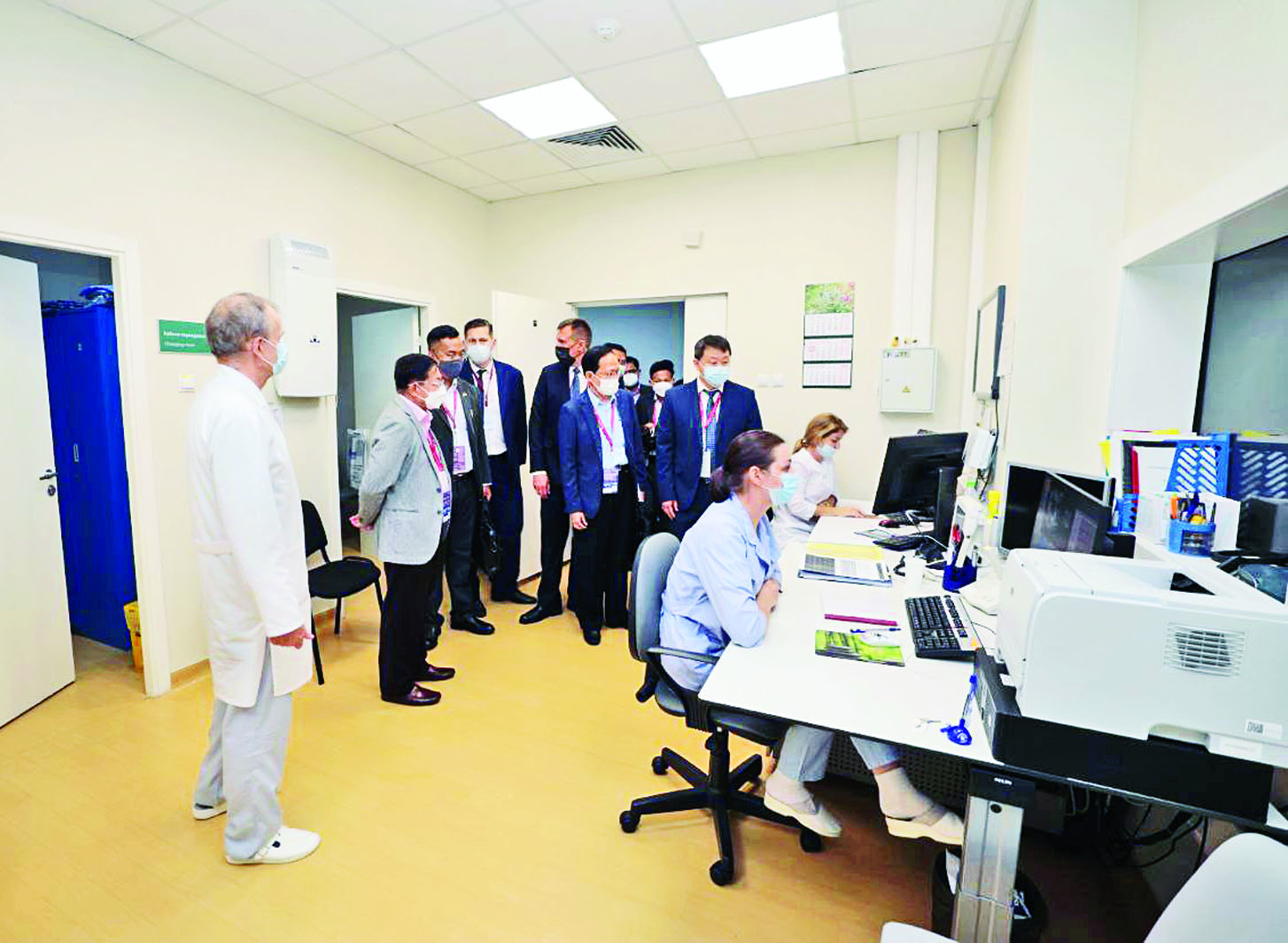 ဆက်လက်ပြီး နိုင်ငံတော်စီမံအုပ်ချုပ်ရေး ကောင်စီဥက္ကဋ္ဌ နိုင်ငံတော်ဝန်ကြီးချုပ်နှင့် အဖွဲ့ဝင်များသည် Medical Center သို့ ရောက်ရှိ ကြရာ Medical Center ၏ ညွှန်ကြားရေးမှူးချုပ် Professor Dr.Igor S. Bryukhovetskiy က Medical Center ၏ ဆောင်ရွက်နေမှု အခြေအနေများနှင့် ပတ်သက်၍ လိုက်လံရှင်းလင်းတင်ပြခဲ့ပြီး နိုင်ငံတော် စီမံအုပ်ချုပ်ရေးကောင်စီဥက္ကဋ္ဌ နိုင်ငံတော်ဝန်ကြီးချုပ်က သိရှိလိုသည်များ ပြန်လည်မေးမြန်း ဆွေးနွေးပြောကြားသည်။