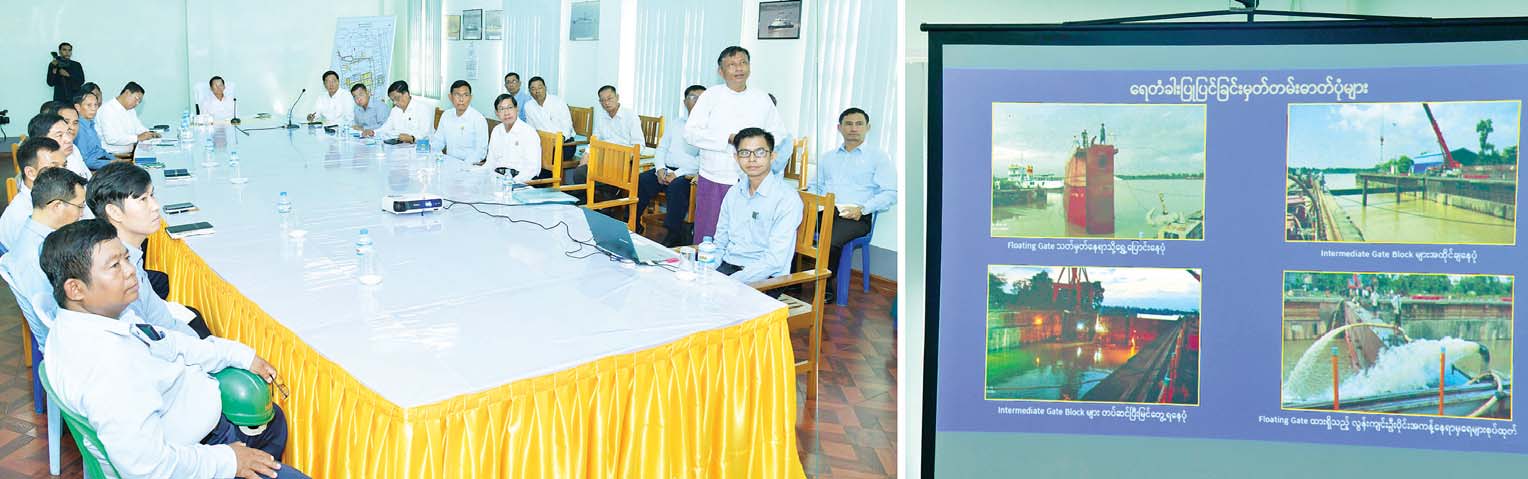 ဦးစွာ နိုင်ငံတော်စီမံအုပ်ချုပ်ရေးကောင်စီဥက္ကဋ္ဌ နိုင်ငံတော်ဝန်ကြီးချုပ်နှင့် အဖွဲ့ဝင်များအား ပို့ဆောင်ရေးနှင့် ဆက်သွယ်ရေးဝန်ကြီးဌာန ပြည်ထောင်စုဝန်ကြီး ဗိုလ်ချုပ်ကြီး တင်အောင်စန်းနှင့် မြန်မာ့သင်္ဘောကျင်းလုပ်ငန်းမှ ဦးဆောင်ညွှန်ကြားရေးမှူး ဦးကျော်နိုင်အေးတို့က မြန်မာ့သင်္ဘောကျင်းလုပ်ငန်း၏ သမိုင်းအကျဉ်း၊ လုပ်ငန်းဆောင်ရွက်ခဲ့မှုနှင့် လုပ်ငန်းဆောင်ရွက်လျက်ရှိသည့် အခြေအနေများ၊ မြန်မာ့သင်္ဘောကျင်းလုပ်ငန်းမှ ပြည်တွင်း၊ ပြည်ပမှ ရေယာဉ်များကိုတည်ဆောက်ခြင်း၊ ပြုပြင်ခြင်းလုပ်ငန်းများကို ဆောင်ရွက်လျက်ရှိသည့်အခြေအနေ များကို ရှင်းလင်းတင်ပြကြသည်။