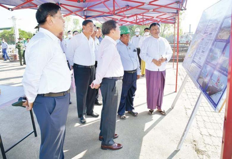 ထို့နောက် နိုင်ငံတော်စီမံအုပ်ချုပ်ရေးကောင်စီဥက္ကဋ္ဌ နိုင်ငံတော်ဝန်ကြီးချုပ်နှင့် အဖွဲ့ဝင်များသည် မြန်မာ့သင်္ဘောကျင်း လုပ်ငန်းအတွင်း လှည့်လည်ကြည့်ရှု၍ တန်ချိန် ၁၂၀၀၀ ရေလုံသင်္ဘောကျင်း လုပ်ငန်းဆောင်ရွက်နေမှု အခြေအနေများကို ကြည့်ရှုစစ်ဆေးကာ တာဝန်ရှိသူများ၏ တင်ပြချက်များအပေါ် လိုအပ်သည်များ မှာကြားဖြည့်ဆည်း ဆောင်ရွက်ပေးသည်။