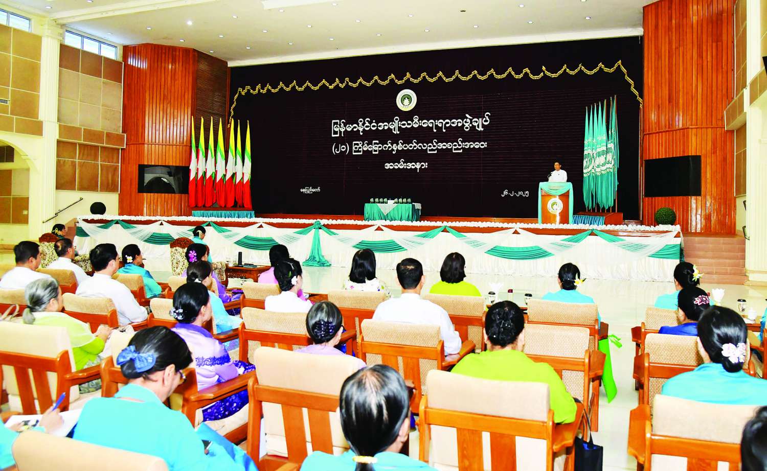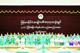 မြန်မာနိုင်ငံ အမျိုးသမီးရေးရာအဖွဲ့ချုပ်၏ (၂၁) ကြိမ်မြောက် နှစ်ပတ်လည်အစည်းအဝေး ဖွင့်ပွဲအခမ်းအနားကို ယနေ့နံနက်ပိုင်းတွင် နေပြည်တော်ရှိ မြန်မာနိုင်ငံ အမျိုးသမီးရေးရာအဖွဲ့ချုပ်ရုံး သီရိရတနာခန်းမ၌ကျင်းပရာ နိုင်ငံတော်စီမံအုပ်ချုပ်ရေးကောင်စီဥက္ကဋ္ဌ နိုင်ငံတော်ဝန်ကြီးချုပ်၏ ဇနီး မြန်မာနိုင်ငံ အမျိုးသမီးရေးရာအဖွဲ့ချုပ် ဂုဏ်ထူးဆောင်နာယက ဒေါ်ကြူကြူလှ တက်ရောက်ချီးမြှင့်သည်။