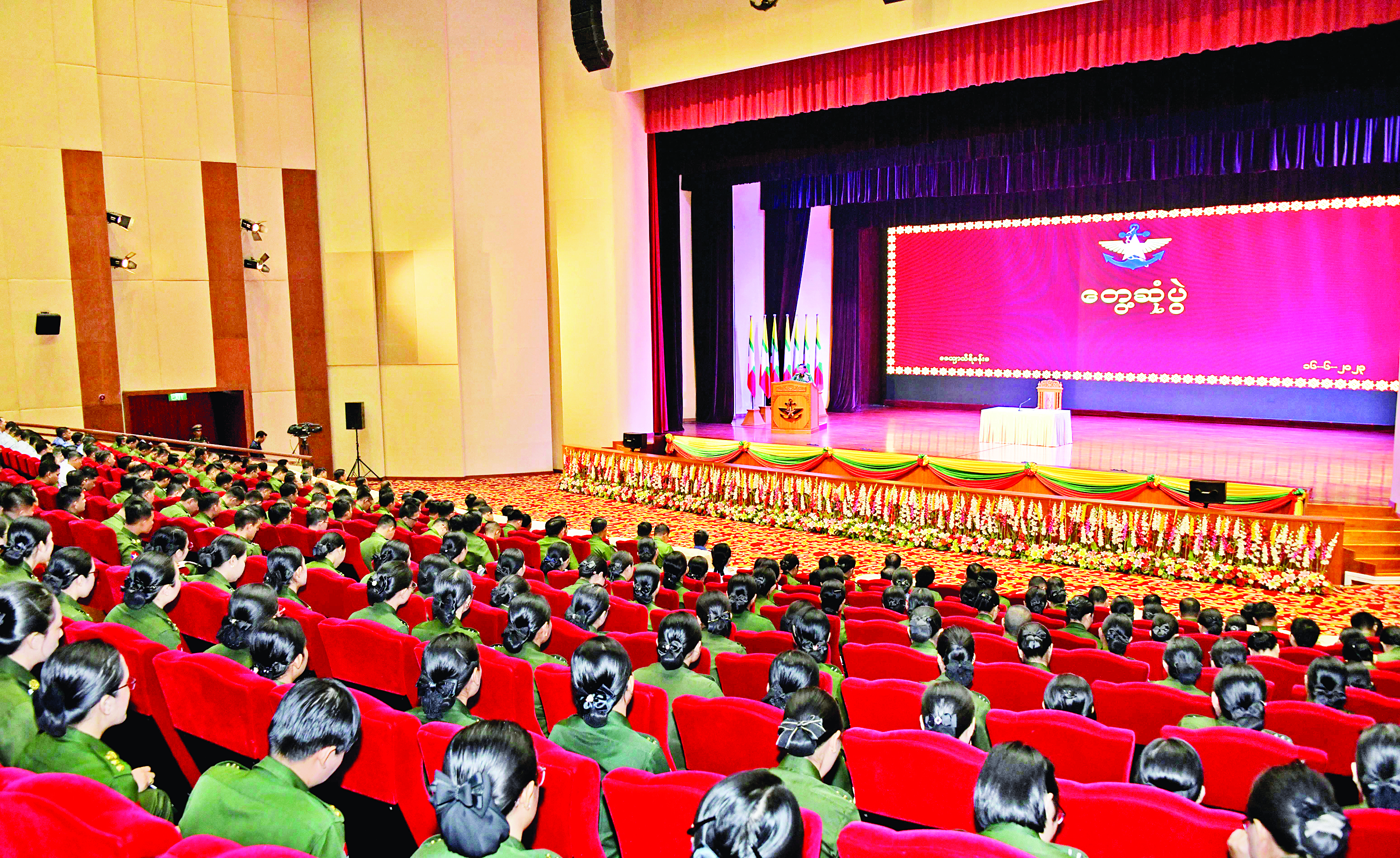 ဦးစွာ နိုင်ငံတော်စီမံအုပ်ချုပ်ရေးကောင်စီဥက္ကဋ္ဌ တပ်မတော်ကာကွယ်ရေးဦးစီးချုပ်က အမှာစကား ပြောကြားရာတွင် ကာကွယ်ရေးဦးစီးချုပ်ရုံး(ကြည်း)ရုံး၊ ဌာနအသီးသီးတွင် တာဝန်ထမ်းဆောင်လျက်ရှိသည့် အရာရှိငယ်များအား တပ်မတော်နှင့် အမျိုးသားနိုင်ငံရေး၊ နိုင်ငံတော်၏ နိုင်ငံရေးဖြစ်ပေါ်ပြောင်းလဲမှု၊ တစ်ဦးချင်းတာဝန်ထမ်းဆောင်မှု စသည်တို့နှင့် ပတ်သက်၍ မှန်မှန်ကန်ကန်သိရှိနားလည်ရန်နှင့် အခြားလိုအပ်သည်များကို မှာကြားနိုင်ရန် ယခုကဲ့သို့ တွေ့ဆုံရခြင်းဖြစ်ကြောင်း၊ မည်သည့်နိုင်ငံတွင်ဖြစ်စေ နိုင်ငံတော်ကို ကာကွယ်ထိန်းသိမ်းစောင့်ရှောက်ရန်မှာ နိုင်ငံသား တိုင်း၏ တာဝန်ပင်ဖြစ်ကြောင်း၊ တစ်နိုင်ငံနှင့်တစ်နိုင်ငံ အခြေအနေများတူညီမှုမရှိကြဘဲ နယ်ချဲ့နိုင်ငံများ၊ ကိုလိုနီပြုခြင်း ခံခဲ့ရသည့်နိုင်ငံ များနှင့် ကိုလိုနီပြုခြင်းမခံခဲ့ရသည့် နိုင်ငံများ စသည်ဖြင့် အမျိုးမျိုးရှိကြောင်း၊ နိုင်ငံ၏ယဉ်ကျေးမှုစရိုက် လက္ခဏာ၊ အမျိုးသားရေးစရိုက်လက္ခဏာများ မပျောက်မပျက်အောင် ထိန်းသိမ်းဆောင်ရွက်ခြင်းသည် အမျိုးသား နိုင်ငံရေးပင်ဖြစ်ကြောင်း၊ နိုင်ငံ၏အမျိုးသားအကျိုးစီးပွားကို ကာကွယ်စောင့်ရှောက် ခြင်းဖြစ်ကြောင်း၊ မိမိတို့နိုင်ငံ၏ အမျိုးသားအကျိုး စီးပွားနှင့် အမျိုးသားနိုင်ငံရေးမှာ သမိုင်းနှင့်ချီ၍ ဖြစ်ပေါ်လာခဲ့သည့် ပြည်ထောင်စုမပြိုကွဲရေး၊ တိုင်းရင်းသားစည်းလုံးညီညွတ်မှုမပြိုကွဲရေး၊ အချုပ်အခြာ အာဏာတည်တံ့ခိုင်မြဲရေးဟူသည့် တို့တာဝန် အရေးသုံးပါးကို ထိန်းသိမ်းဆောင်ရွက်ခြင်းပင်ဖြစ်ကြောင်း။