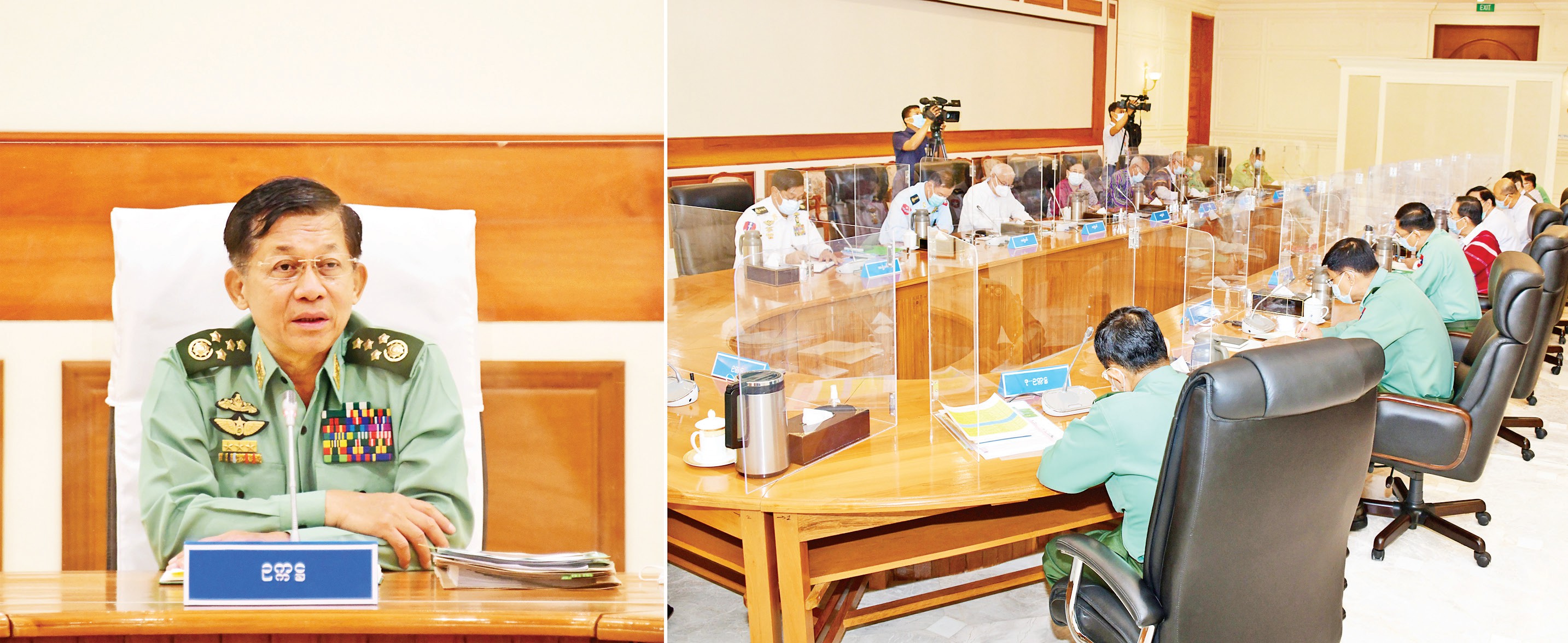 နိုင်ငံတော်စီမံအုပ်ချုပ်ရေးကောင်စီဥက္ကဋ္ဌက အဖွင့်အမှာစကားပြောကြားရာတွင် ယခင် အစည်းအဝေးများတွင် နိုင်ငံတော်စီမံအုပ်ချုပ်ရေးကောင်စီ၏ ရည်မှန်းချက်တာဝန်များကို ချပြဆွေးနွေး ခဲ့ကြပြီးကောင်စီဝင်များကဒေသအလိုက်အခြေအနေများနှင့် တိုင်းပြည်၏ လိုအပ်ချက်အခြေအနေများကို တင်ပြကာ အပြန်အလှန်ညှိနှိုင်းဆွေးနွေး အကောင်အထည်ဖော်မှုများ ရှိခဲ့သဖြင့် လုပ်ငန်းများ အထိုက် အလျောက် အောင်မြင်အောင် ဆောင်ရွက်နိုင်ခဲ့ကြောင်း၊ မိမိတို့အနေဖြင့် မည်သည့်ဒေသ၊ မည်သည့် ပါတီ၊ မည်သည့်တိုင်းရင်းသားအဖြစ် ပါဝင်ဆောင်ရွက်နေကြသည်ဖြစ်စေ ကောင်စီအဖွဲ့ဝင်များ အားလုံးအနေဖြင့် တိုင်းပြည်အကျိုးဆောင်ရွက် လိုသည့်စိတ်ဖြင့် အားလုံးစုပေါင်းဆောင်ရွက်ကြရမည်ဖြစ်ကြောင်း၊ ယခင်အစည်းအဝေးများတွင် ကောင်စီဝင်များ ဆွေးနွေးခဲ့သည့် ဥပဒေများပြန်လည် စိစစ်ရေးနှင့်ပတ်သက်၍ အချို့ပြဋ္ဌာန်းခဲ့သည့် ဥပဒေများသည် ဥပဒေသတ်မှတ်ချက်များနှင့် ညီညွတ်မှု ရှိ/မရှိ စိစစ်ဆောင်ရွက်နေကြောင်း၊ လုံခြုံရေးအရဆောင်ရွက်သင့်သည် ဥပဒေများကိုလည်း ပြဋ္ဌာန်း ထားပြီးဖြစ်၍ အဆိုပါဥပဒေများကို ထိန်းကျောင်း ဆောင်ရွက်မှုနှင့် ကျင့်သုံးမှုများကို စဉ်းစားဆောင်ရွက်ရန်လိုကြောင်း။ စာသင်ကျောင်းများ ပြန်လည်ဖွင့်လှစ်ရေး မိမိတို့ကောင်စီ စတင်တာဝန်ယူချိန်မှစ၍ စာသင်ကျောင်းများ ပြန်လည်ဖွင့်လှစ်ရေးအတွက် စီမံဆောင်ရွက်လျက်ရှိကြောင်း၊ ထိုသို့ဆောင်ရွက်ချိန်တွင် အခြေခံပညာကျောင်းများမှ ဆရာ ဆရာမအချို့ CDM ပြုလုပ်ခြင်းများရှိကြောင်း၊ ကျောင်းများ ပြန်လည်ဖွင့်လှစ်နိုင်ရေးအတွက် အထက်တန်းနှင့် အလယ်တန်းကျောင်းများမှ ကျောင်းအုပ်ကြီးများအား မွမ်းမံသင်တန်းများ ဖွင့်လှစ်ချိန်တွင် ပျက်ကွက်သည့် ဆရာ ဆရာမအချို့ရှိကြောင်း၊ ပျက်ကွက်မှု ဖြစ်ပွားသည့် ဆရာ ဆရာမများသည် CDM ပြုလုပ်ရန်အတွက် ခြိမ်းခြောက်ခံရမှုများရှိခြင်းကြောင့်ဟု သိရှိရကြောင်း၊ အဆင့်မြင့်ပညာတက္ကသိုလ်၊ ကောလိပ်များမှ ဆရာ ဆရာမများနှင့် ဆေးရုံများမှ ဆရာဝန်များလည်း အလားတူခြိမ်းခြောက်ခံရမှုများရှိသည်ဟု သိရှိရကြောင်း၊ မိမိတို့အား ခြိမ်းခြောက် နေသူများကို သက်ဆိုင်ရာသို့ သတင်းပို့တိုင်ကြားရန် လိုကြောင်း၊ အချို့ဆရာ ဆရာမများနှင့် ဆရာဝန် များအနေဖြင့် တာဝန်များပြန်လည်ထမ်းဆောင် လိုသော်လည်း အရေးယူခံရမည်ကို စိုးရိမ်သည့် အတွက်ကြောင့် ပျက်ကွက်မှုများရှိနေကြောင်း။
