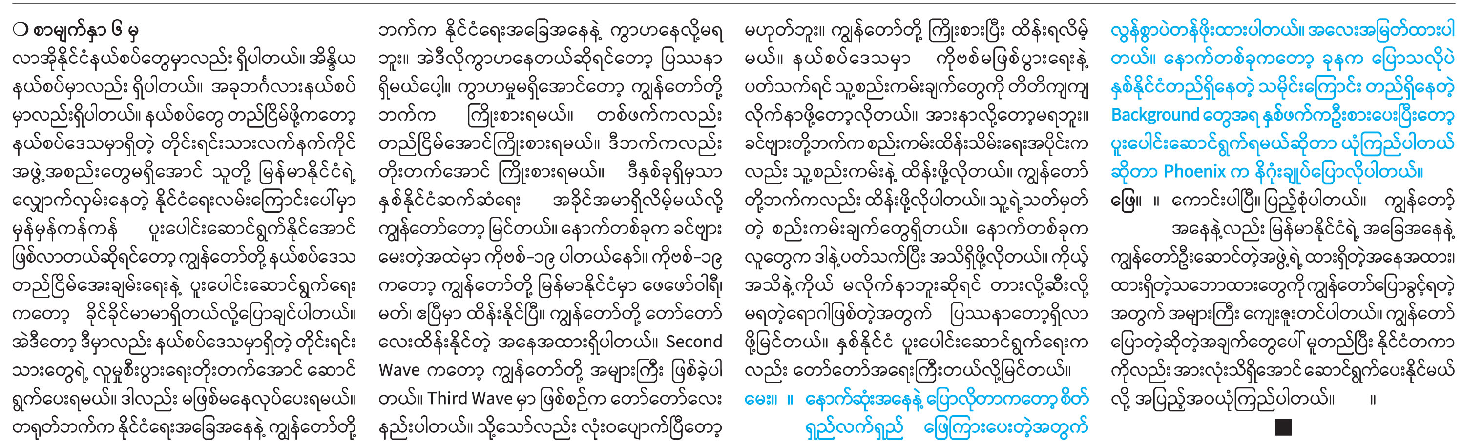 နိုင်ငံတော်စီမံအုပ်ချုပ်ရေးကောင်စီဥက္ကဋ္ဌ တပ်မတော်ကာကွယ်ရေးဦးစီးချုပ် ဗိုလ်ချုပ်မှူးကြီး မင်းအောင်လှိုင်အား တရုတ်ပြည်သူ့သမ္မတနိုင်ငံ Phoenix ရုပ်သံမီဒီယာက တွေ့ဆုံမေးမြန်းခြင်း