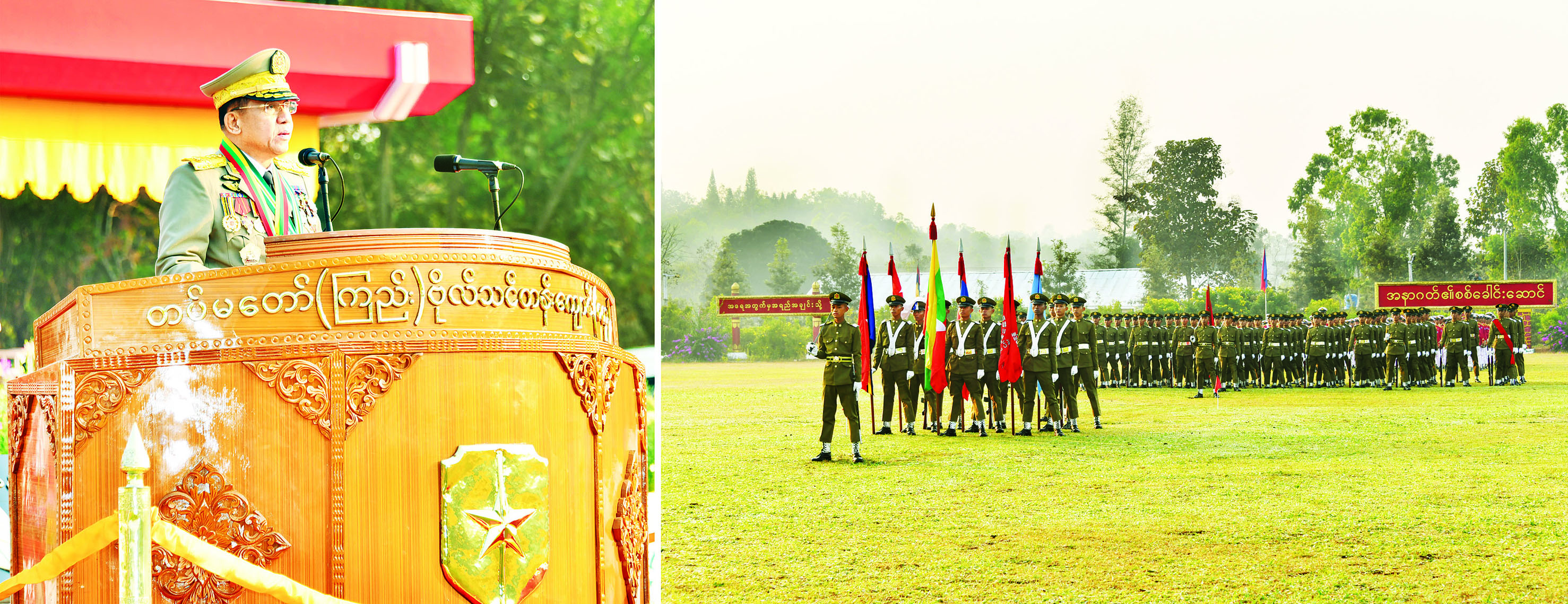 တပ်မတော်(ကြည်း) ဗိုလ်သင်တန်းကျောင်း(ဗထူး) ဗိုလ်လောင်းသင်တန်း အမှတ်စဉ်(၁၂၈) သူရတပ်ခွဲ သင်တန်းဆင်း ဂုဏ်ပြုစစ်ရေးပြအခမ်းအနားကို ယနေ့နံနက်ပိုင်းတွင် ဗထူးမြို့၊ တပ်မတော်(ကြည်း) ဗိုလ်သင်တန်း ကျောင်း(ဗထူး)စစ်ရေးပြကွင်း၌ ကျင်းပရာ နိုင်ငံတော်စီမံအုပ်ချုပ်ရေးကောင်စီဥက္ကဋ္ဌ တပ်မတော်ကာကွယ်ရေး ဦးစီးချုပ် ဗိုလ်ချုပ်မှူးကြီး သတိုးမဟာသရေစည်သူ သတိုးသီရိသုဓမ္မ မင်းအောင်လှိုင် တက်ရောက်မိန့်ခွန်း ပြောကြားသည်။