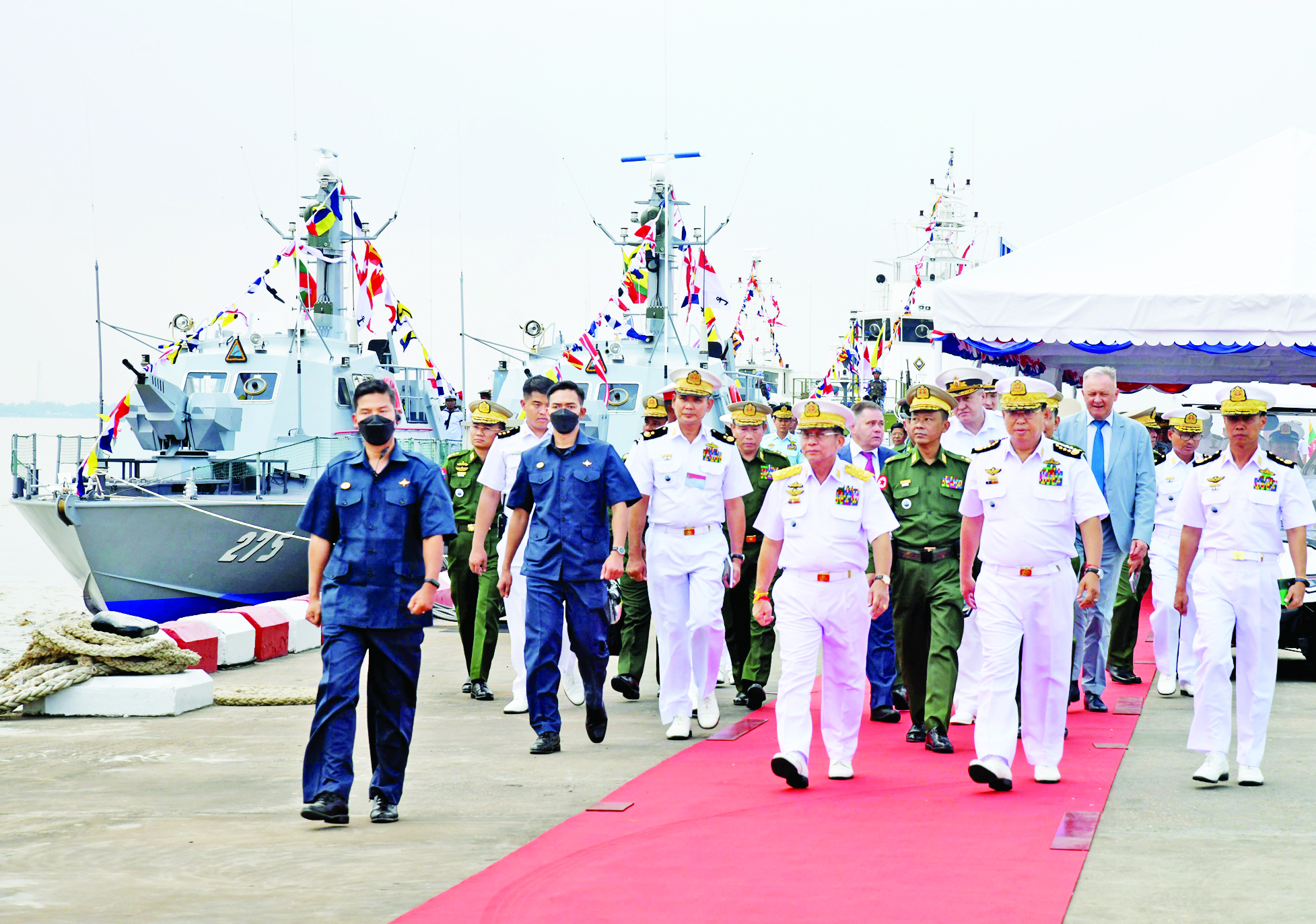 ပြည်ထောင်စုသမ္မတ မြန်မာနိုင်ငံတော် တပ်မတော်(ရေ)၏ (၇၅)နှစ်မြောက် စိန်ရတု တပ်မတော်(ရေ) နှစ်ပတ်လည်နေ့တွင် နိုင်ငံတော်၏ ရေကြောင်းဆိုင်ရာ အကျိုးစီပွားများနှင့် မြန်မာ့ပင်လယ်ပြင် သီးသန့်စီးပွား ရေးဇုန်အား အပြည့်အဝကာကွယ် စောင့်ရှောက်နိုင်ရန် အတွက် စစ်ရေယာဉ်များ တပ်တော်ဝင် ခြင်းနှင့် မြန်မာနိုင်ငံကမ်းခြေစောင့်တပ်ဖွဲ့သို့ လွှဲပြောင်းတပ်တော်ဝင် ခြင်းအခမ်းအနားကို ရန်ကုန်မြို့ရှိ အမှတ်(၃) ရေတပ်ဆိပ်ခံတံတား၌ ကျင်းပပြုလုပ်ရာ နိုင်ငံတော်စီမံအုပ်ချုပ်ရေးကောင်စီဥက္ကဋ္ဌ တပ်မတော်ကာကွယ်ရေး ဦးစီးချုပ် ဗိုလ်ချုပ်မှူးကြီး မင်းအောင်လှိုင် တက်ရောက်ဂုဏ်ပြုချီးမြှင့်သည်။
