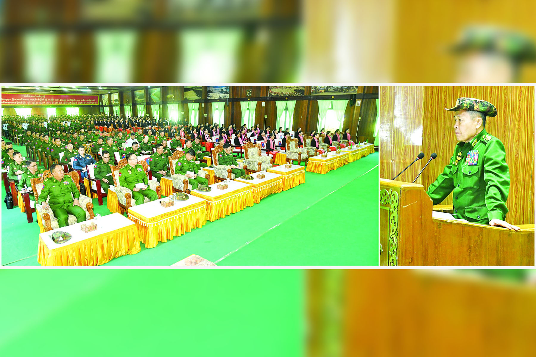 အရာရှိ၊ စစ်သည်၊ မိသားစုများအနေဖြင့် တပ်မတော် (ကြည်း၊ ရေ၊ လေ) လုပ်ငန်းလမ်းစဉ်ပါ တပ်မတော်သားတစ်ဦးချင်း ပြုကျင့်လိုက်နာရမည့် စစ်သည်တော် ကျင့်ဝတ် ၂၀ ပါးပါ ရိုးရိုးပဲနေထိုင် စားသောက်ပါ၊ မိမိဝင်ငွေနှင့် ထွက်ငွေညီမျှပါစေ ဆိုသည့်အချက်နှင့် မူးယစ်ဆေးဝါးသုံးစွဲခြင်း၊ အရက် သေစာသောက်စားခြင်းနှင့် လောင်းကစားခြင်း ရှောင်ပါ၊ တံစိုးလက်ဆောင်ကို မစင်ကဲ့သို့ ရွံရှာစက်ဆုပ်ပါဆိုသည့်အတိုင်း မိမိကိုယ်ကို အကျိုးမဖြစ်စေနိုင်သည့် အသောက်အစား၊ အပျော်အပါးနှင့် အစားအသောက်များကို ကိုယ်စီအသိစိတ်ဖြင့် ထိန်းထိန်းသိမ်းသိမ်းဆောင်ရွက်သွားကြရန် မှာကြား လိုကြောင်း၊ မိမိတို့ရရှိသည့်ဝင်ငွေနှင့်ထွက်ငွေကို မျှတအောင် သုံးစွဲခြင်းဖြင့် သက်သာချောင်ချိမှုကို ဖန်တီးနိုင်မည်ဖြစ်ပြီး ဝင်ငွေနှင့် ထွက်ငွေမျှတမှုရှိစေရေး အသုံးနှင့်အဖြုန်းကို ခွဲခြားသိရှိဆောင်ရွက်ကြရန်လိုကြောင်း၊ တပ်မတော်အနေဖြင့် တပ်မတော်သားများ၏ သက်သာချောင်ချိရေးအတွက် ဆောင်ရွက်ပေးလျက်ရှိသကဲ့သို့ တပ်ပိုင်နှင့်တစ်ပိုင်တစ်နိုင် စိုက်ပျိုးမွေးမြူရေးလုပ်ငန်းများ ဆောင်ရွက်ခြင်းကို မှန်မှန်ကန်ကန် ဆောင်ရွက်သွားမည်ဆိုပါက သက်သာချောင်ချိရေးအတွက်များစွာအထောက် အကူပြုစေမည်ဖြစ်ကြောင်း၊ မိမိတို့ဘဝတိုးတက်ရေးအတွက် အလိမ္မာစာမှာရှိ ဆိုသည့်အတိုင်း တပ်တိုင်းတွင်စာကြည့်တိုက်များ ထားရှိပေးထားပြီးဖြစ်၍ စာကောင်းပေမွန်များကို ဖတ်မှတ်လေ့လာ ကြရန်လိုကြောင်း၊ စာများများ ဖတ်ရှုလေ့လာမှသာ အသိပညာဗဟုသုတများ ရရှိလာမည်ဖြစ်ပြီး အမှား နှင့်အမှန်၊ အကောင်းနှင့်အဆိုးကို ခွဲခြားနိုင်မည်ဖြစ်ကြောင်း၊ သို့ဖြစ်၍ အရာရှိ ၊ စစ်သည်၊ မိသားစုများအနေဖြင့် စာများများ တိုးတက်ဖတ်ရှုကြရန်လိုကြောင်း၊ တပ်မတော်ကာကွယ်ရေးဦးစီးချုပ်၏ အမြဲလမ်းညွှန်မှာကြားချက်ဖြစ်သည့် သင့်လေးသင့်ကို လိုက်နာဆောင်ရွက်သွားကြရမည်ဖြစ်ကြောင်း၊ သင့်လေးသင့်ဆိုသည်မှာ သွားသင့်သည့်နေရာကိုသွားရန်၊ ပြောဆိုသင့်သည့် စကားကိုသာပြောဆိုရန်၊ လုပ်သင့်သည့် အလုပ်ကိုသာလုပ်ရန်နှင့် ပေါင်းသင်း သည့်သူကိုသာ ပေါင်းသင်းသွားရန်တို့ ဖြစ်ကြောင်းနှင့် နိုင်ငံတော်နှင့် တပ်မတော်ကအားထားရသည့် နိုင်ငံသားကောင်းများဖြစ်အောင်ပေးအပ်သည့် တာဝန်များကို သစ္စာရှိစွာဖြင့် ကျေပွန်စွာထမ်းဆောင်သွားကြရန်လိုကြောင်းဖြင့် ပြောကြားသည်။