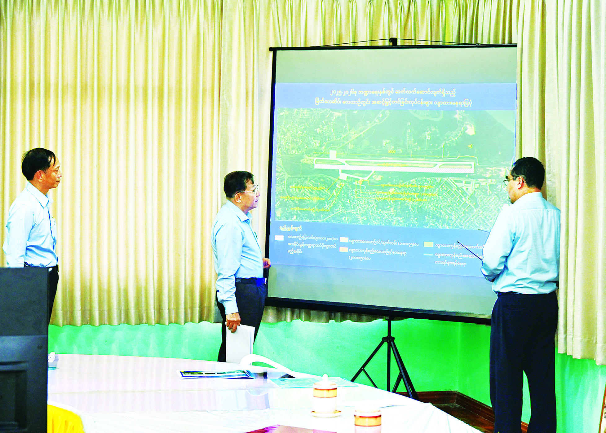 ရှင်းလင်းတင်ပြမှုများအပေါ် နိုင်ငံတော်ယာယီသမ္မတ နိုင်ငံတော်လုံခြုံရေးနှင့် အေးချမ်းသာယာရေး ကော်မရှင်ဥက္ကဋ္ဌက လေယာဉ်ပြေးလမ်းအား အဆင့်မြှင့်တင်သွားရန်၊ လေဆိပ်အဆောက်အအုံများအား စနစ်တကျဖြင့် ပြန်လည်တွက်ချက်၍ ဆောင်ရွက်သွားရန်နှင့် အခြားလိုအပ်သည်များကို လမ်းညွှန်မှာကြားသည်။