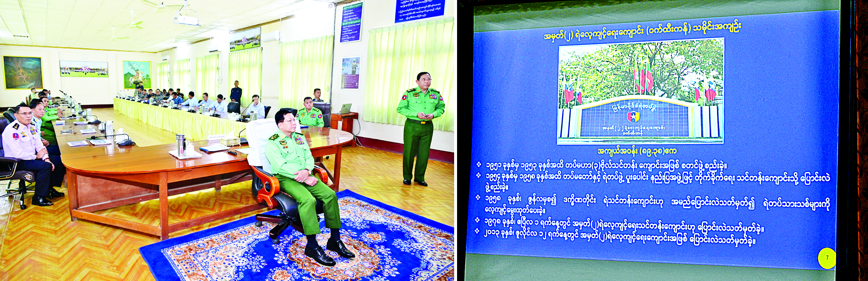ဆက်လက်ပြီး နိုင်ငံတော်ယာယီသမ္မတ နိုင်ငံတော်လုံခြုံရေးနှင့် အေးချမ်းသာယာရေးကော်မရှင် ဥက္ကဋ္ဌနှင့် အဖွဲ့ဝင်များသည် ရဲအရာရှိ လေ့ကျင့်ရေးကျောင်း (ဇီးပင်ကြီး) သို့ ရောက်ရှိရာ လေ့ကျင့်ရေးဌာနချုပ်ရုံး အစည်းအဝေးခန်းမ၌ ကော်မရှင်အဖွဲ့ဝင် ပြည်ထဲရေးဝန်ကြီးဌာန ပြည်ထောင်စုဝန်ကြီး ဒုတိယဗိုလ်ချုပ်ကြီး ထွန်းထွန်းနောင်က ရဲအရာရှိများအား လေ့ကျင့်ပေးနေသည့် ကျောင်းများနှင့် အခြားအဆင့် ရဲတပ်ဖွဲ့ဝင်များအား လေ့ကျင့်ပေးနေသည့် ကျောင်းများ၏ သမိုင်းအကျဉ်း၊ ဗဟိုမီးသတ်သင်တန်းကျောင်း သမိုင်းအကျဉ်းကို လည်းကောင်း၊ ရဲအရာရှိ လေ့ကျင့်ရေးကျောင်း (ဇီးပင်ကြီး) ကျောင်းအုပ်ကြီးနှင့် ဗဟိုမီးသတ်သင်တန်းကျောင်း (ပြင်ဦးလွင်) ကျောင်းအုပ်ကြီးတို့က သင်တန်းကျောင်းဆိုင်ရာ အချက်အလက်များ၊ သင်တန်းများအလိုက် ဖွင့်လှစ်သင်ကြားပေးနိုင်ခဲ့မှု၊ စာပေပညာ၊ စစ်ပညာနှင့် ကြံ့ခိုင်ရေးဘာသာရပ်များ သင်ကြားလေ့ကျင့်ပေးလျက်ရှိမှု၊ သင်တန်းကျောင်းများအလိုက် ဝန်ထမ်းများ ခန့်အပ်ထားရှိမှု၊ စိုက်ပျိုးမွေးမြူရေးလုပ်ငန်းများ ဆောင်ရွက်ထားရှိမှုနှင့် သက်သာချောင်ချိရေး ဆောင်ရွက်ပေးနိုင်မှု၊ သောက်သုံးရေနှင့် လျှပ်စစ်မီးရရှိမှု အခြေအနေများ၊ သင်တန်းများအလိုက် လက်တွေ့လေ့ကျင့်ခန်းများ ဆောင်ရွက်လျက်ရှိမှုနှင့် လေ့ကျင့်ရေးအဆောက်အအုံများ၊ အထောက်အကူပြုယာဉ်များ ဆောင်ရွက်ထားရှိမှု အခြေအနေများကိုလည်းကောင်း ရှင်းလင်းတင်ပြကြသည်။