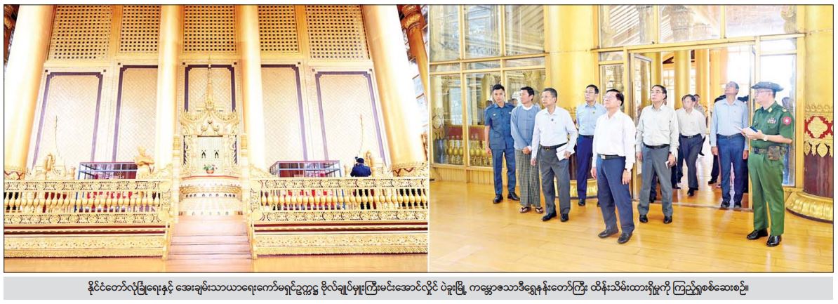 နိုင်ငံတော်လုံခြုံရေးနှင့်အေးချမ်းသာယာရေးကော်မရှင်ဥက္ကဋ္ဌ ဗိုလ်ချုပ်မှူးကြီး မင်းအောင်လှိုင်သည် ယနေ့တွင် ဇနီး ဒေါ်ကြူကြူလှ၊ အမျိုးသားကာကွယ်ရေးနှင့်လုံခြုံရေးကောင်စီတွဲဖက်အမှုဆောင်ချုပ် ဗိုလ်ချုပ်ကြီး ရဲဝင်းဦးနှင့် ဇနီး၊ ခရီးစဉ်တွင်လိုက်ပါလာသည့် အဖွဲ့ဝင်များ၊ ပဲခူးတိုင်းဒေသကြီး ဝန်ကြီးချုပ်နှင့် တာဝန်ရှိသူများလိုက်ပါ၍ ပဲခူးမြို့ ကမ္ဘောဇသာဒီရွှေနန်းတော်ကြီး ရှေးဟောင်း ယဉ်ကျေးမှုဆိုင်ရာ အမွေအနှစ်နေရာများ ပြုပြင်ထိန်းသိမ်းခြင်းလုပ်ငန်းများ ဆောင်ရွက်နေမှု အခြေအနေများကို သွားရောက်ကြည့်ရှုစစ်ဆေးသည်။