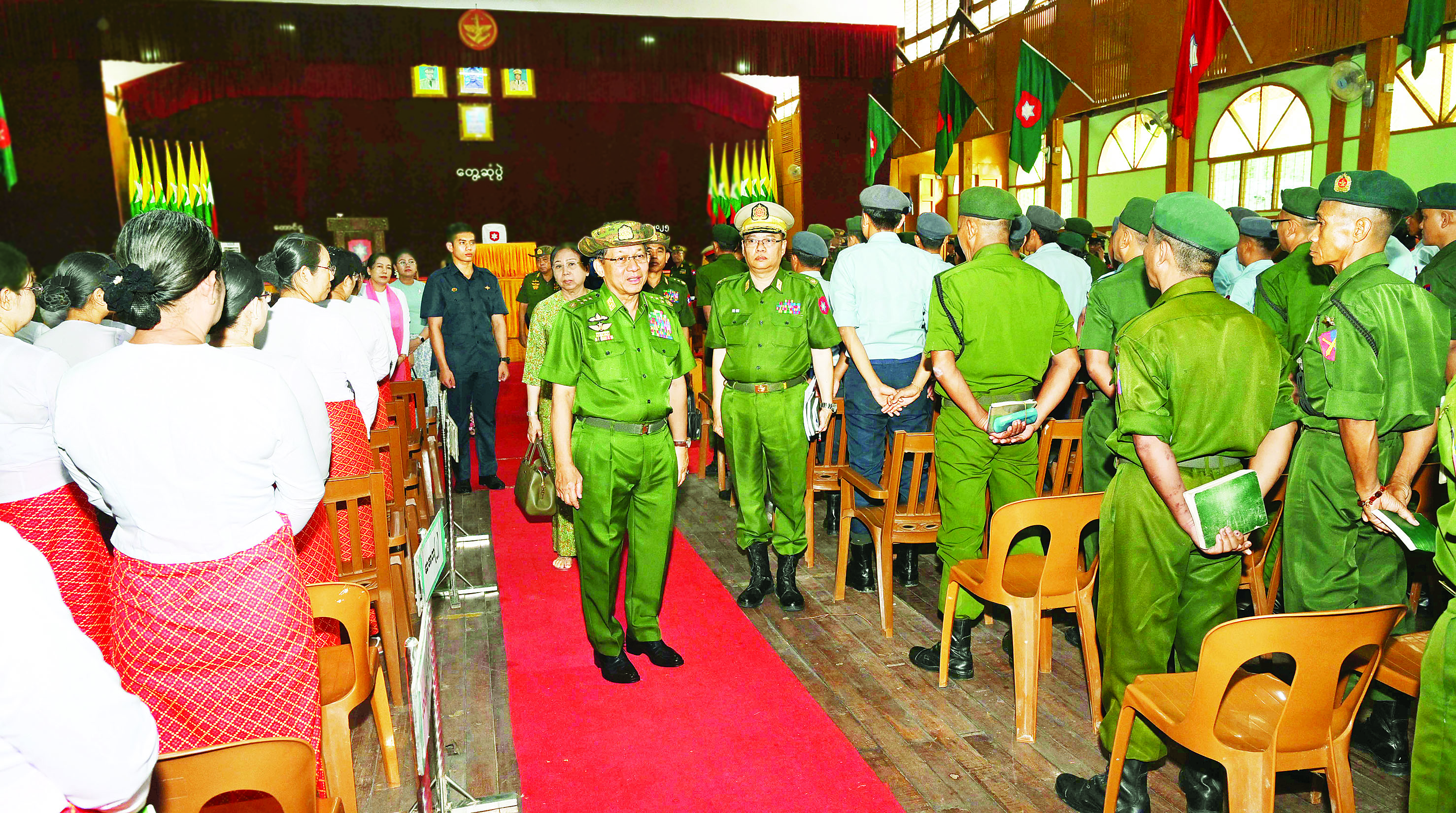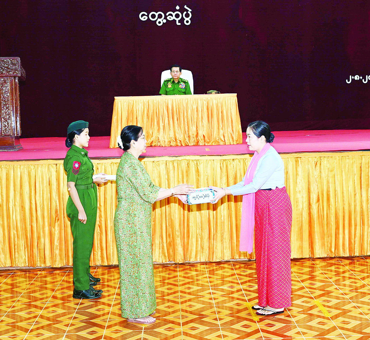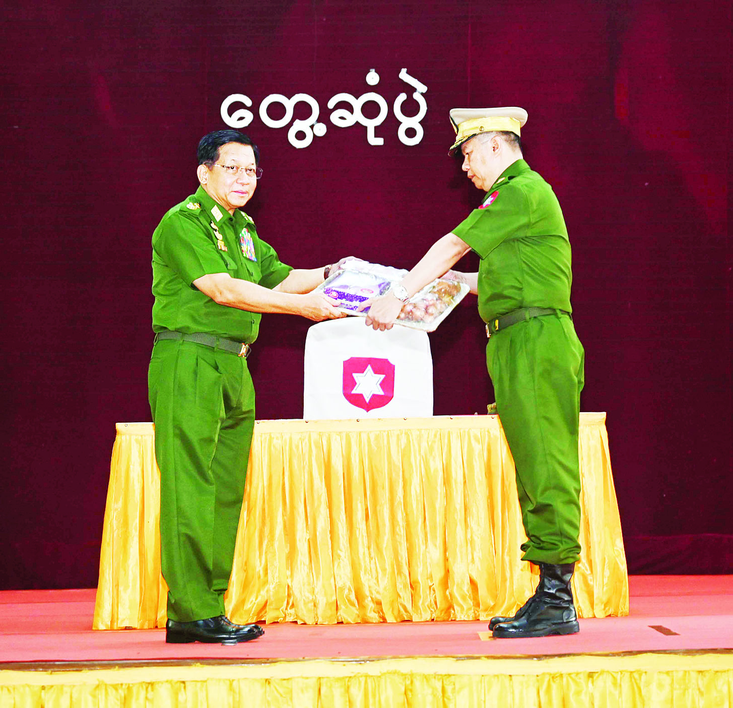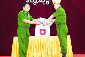 ယင်းနောက် နိုင်ငံတော်လုံခြုံရေးနှင့် အေးချမ်းသာယာရေးကော်မရှင်ဥက္ကဋ္ဌ တပ်မတော်ကာကွယ်ရေးဦးစီးချုပ်က တပ်နယ်မှ အရာရှိ၊ စစ်သည်၊ မိသားစုများအတွက် စားသောက်ဖွယ်ရာပစ္စည်းများကို ပေးအပ်ရာ တိုင်းမှူးကလည်းကောင်း၊ နိုင်ငံတော်လုံခြုံရေးနှင့် အေးချမ်းသာယာရေးကော်မရှင်ဥက္ကဋ္ဌ တပ်မတော်ကာကွယ်ရေးဦးစီးချုပ်၏ ဇနီးက တပ်နယ်မိခင်နှင့် ကလေးစောင့်ရှောက်ရေးအသင်းအတွက် ချီးမြှင့်ငွေများကိုပေးအပ်ရာ တိုင်းမှူး၏ ဇနီးကလည်းကောင်း လက်ခံရယူကြသည်။