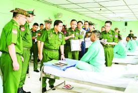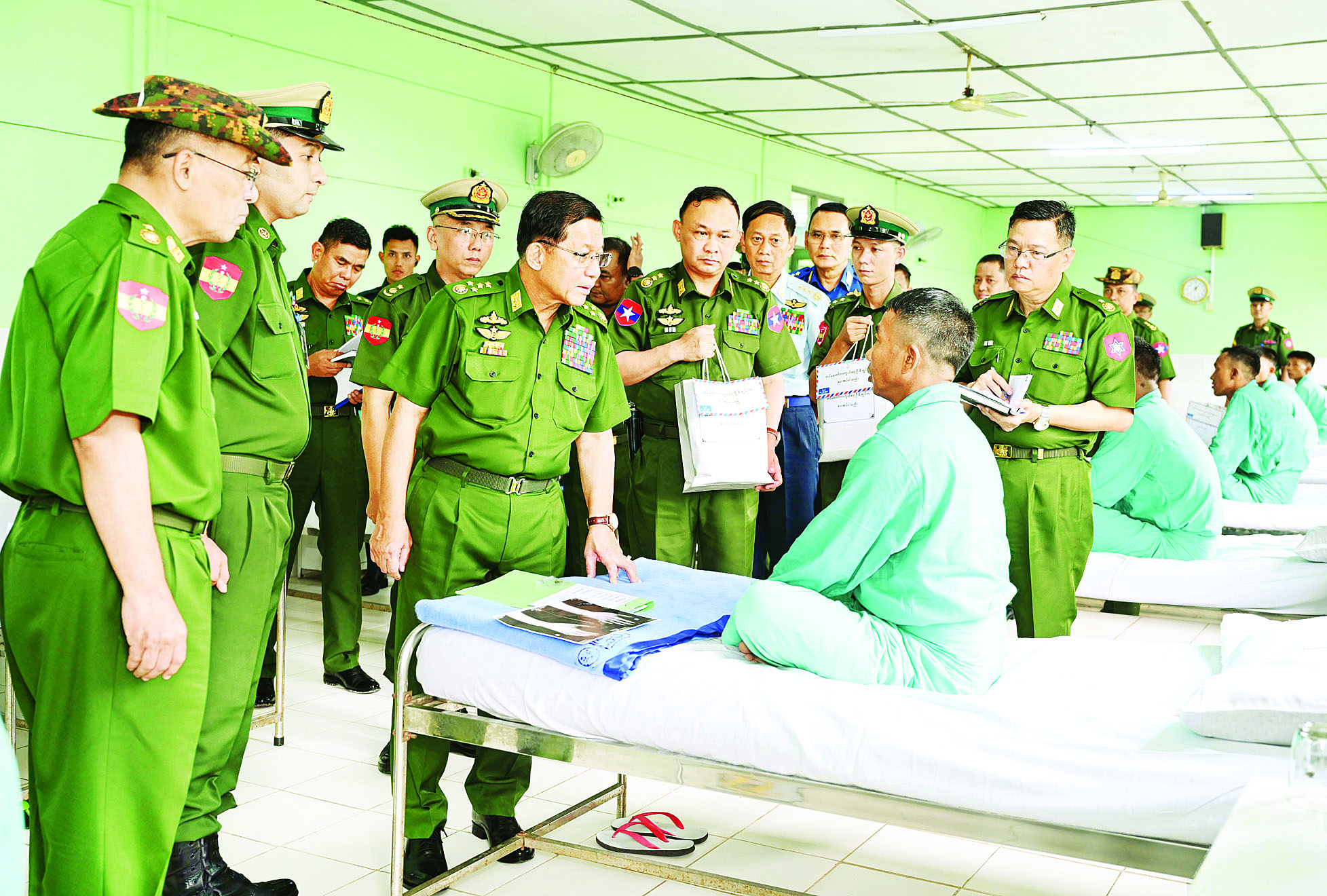 ဆက်လက်၍ နိုင်ငံတော်လုံခြုံရေးနှင့် အေးချမ်းသာယာရေးကော်မရှင်ဥက္ကဋ္ဌ တပ်မတော်ကာကွယ်ရေးဦးစီးချုပ်သည် တပ်နယ်ရှိ နယ်မြေခံတပ်မတော်ဆေးရုံတွင် တက်ရောက်ကုသလျက်ရှိသည့် နိုင်ငံတော်ကာကွယ်ရေးနှင့် လုံခြုံရေးတာဝန်များ ထမ်းဆောင်စဉ် ထိခိုက်ဒဏ်ရာရရှိခဲ့သော အရာရှိ၊ စစ်သည်များအား ထိခိုက်ဒဏ်ရာရရှိခဲ့မှုအခြေအနေများ၊ ရောဂါကုသပျောက်ကင်းမှုအခြေအနေများကို တစ်ဦးချင်း လိုက်လံတွေ့ဆုံ၍ ရင်းနှီးနွေးထွေးစွာ မေးမြန်းပြီး အားပေးစကားပြောကြားကာ အရာရှိ၊ စစ်သည်များ၏ တင်ပြချက်များအပေါ် လိုအပ်သည်များ ဖြည့်ဆည်းဆောင်ရွက်ပေးသည်။