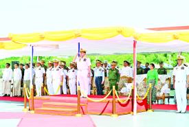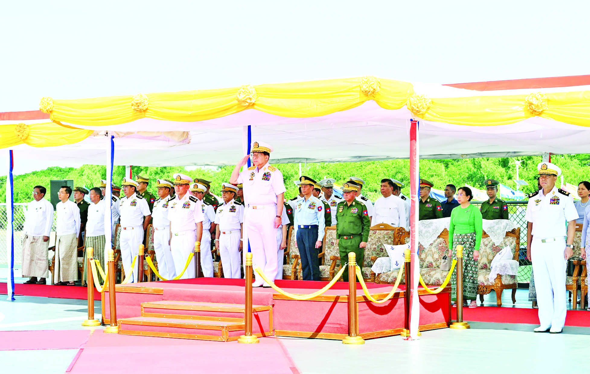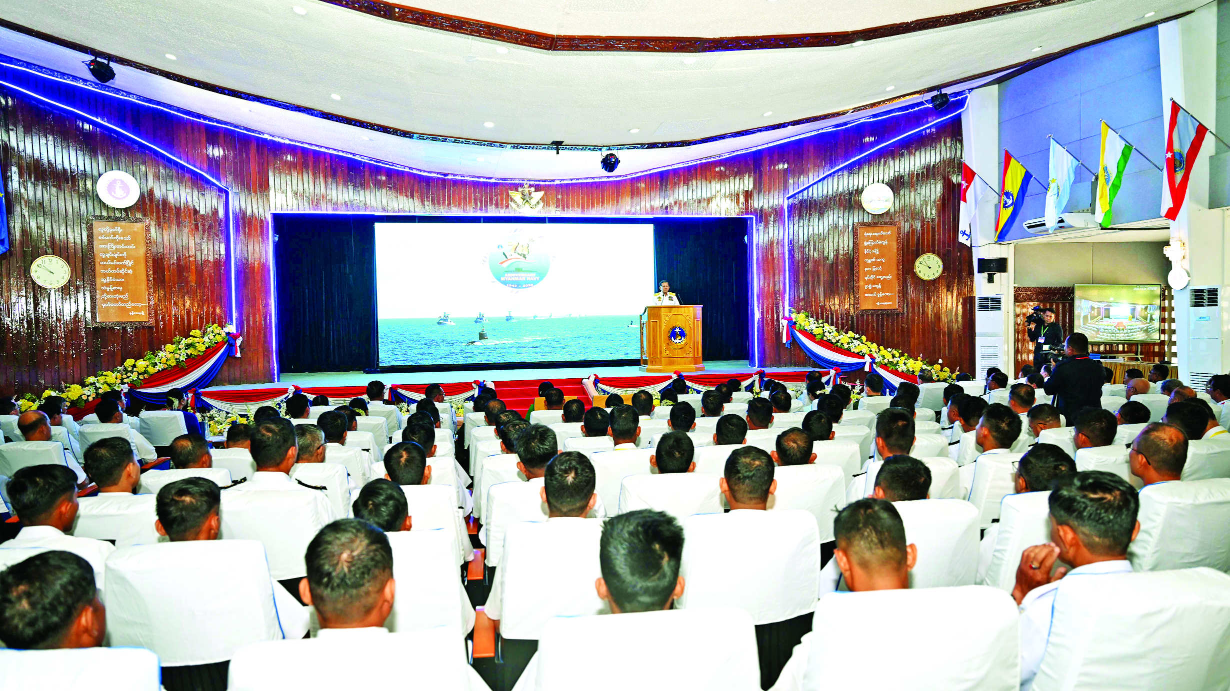 ယင်းနောက် နိုင်ငံတော်လုံခြုံရေးနှင့် အေးချမ်းသာယာရေး ကော်မရှင်ဥက္ကဋ္ဌ တပ်မတော် ကာကွယ်ရေး ဦးစီးချုပ်က တပ်မတော်(ရေ) အရာရှိ၊ စစ်သည်များအား လမ်းညွှန်အမှာစကား ပြောကြားရာတွင် မြန်မာ့တပ်မတော်တွင် တပ်မတော်(ရေ)ကို (၇၈)နှစ်တာ ကာလအတွင်း အဆင့်ဆင့် တိုးချဲ့ဖွဲ့စည်း တည်ဆောက်ခဲ့ခြင်းဖြစ်ပြီး လက်ရှိအခြေအနေတွင် စစ်ရေယာဉ်များ ကို ကိုယ်တိုင်တည်ဆောက် အသုံးပြုနေနိုင်သည့် အနေအထားသို့ ရောက်ရှိခဲ့ပြီဖြစ်ကြောင်း၊ တပ်မတော်သားတိုင်းအနေဖြင့် ကျန်းမာကြံ့ခိုင်မှုရှိရမည်၊ ရဲစွမ်းသတ္တိနှင့် တိုက်ရဲခိုက်ရဲသည့် စိတ်ဓာတ်ရှိရမည်၊ မိမိတို့တစ်ဦးချင်း တာဝန်များကို သက်ဆိုင်ရာ ပညာရပ်များအလိုက် ကျွမ်းကျင် ပိုင်နိုင်နေရမည် ဖြစ်ကြောင်း၊ “လေ့လာ၊ လေ့ကျင့်၊ လိုက်နာ” ဆိုသည့် မူဝါဒနှင့်အညီ စဉ်ဆက်မပြတ် ပြောင်းလဲတိုးတက်နေသည့် စစ်အတတ်ပညာများနှင့် မျက်ခြည်မပြတ် လေ့လာနေရမည်၊ သင်ယူတတ်မြောက်ပြီး ဖြစ်သည့် စစ်အတတ်ပညာများကို ပိုမို ကျွမ်းကျင်ပိုင်နိုင်အောင် အမြဲလေ့ကျင့်နေရမည်၊ ချမှတ်ထားသည့် စည်းမျဉ်းစည်းကမ်းများ၊ အမိန့်နှင့်ညွှန်ကြားချက်များကို အမြဲလိုက်နာကျင့်သုံးနေရမည် ဖြစ်ကြောင်း၊ ကမ္ဘာတည်သရွေ့ မြန်မာနိုင်ငံတော် တည်ရှိရမည်၊ မြန်မာနိုင်ငံတော်တည်ရှိနေသရွေ့ မြန်မာ့တပ်မတော်တည်ရှိရမည်၊ မြန်မာ့တပ်မတော် တည်ရှိနေသရွေ့ တပ်မတော်(ရေ)သည်လည်း တည်ရှိရမည် ဖြစ်ကြောင်း၊ တပ်မတော်(ရေ)အနေဖြင့် ရှိပြီး ဖြစ်သည့် ကောင်းမွန်သော အစဉ်အလာများကို စဉ်ဆက်မပြတ် ဆက်လက်ထိန်းသိမ်း လက်ဆင့် ကမ်းကာ တပ်မတော်(ရေ)နှင့် တပ်မတော်၏ဂုဏ်ကို ထိန်းသိမ်းသွားကြရမည် ဖြစ်ကြောင်း မှာကြားသည်။