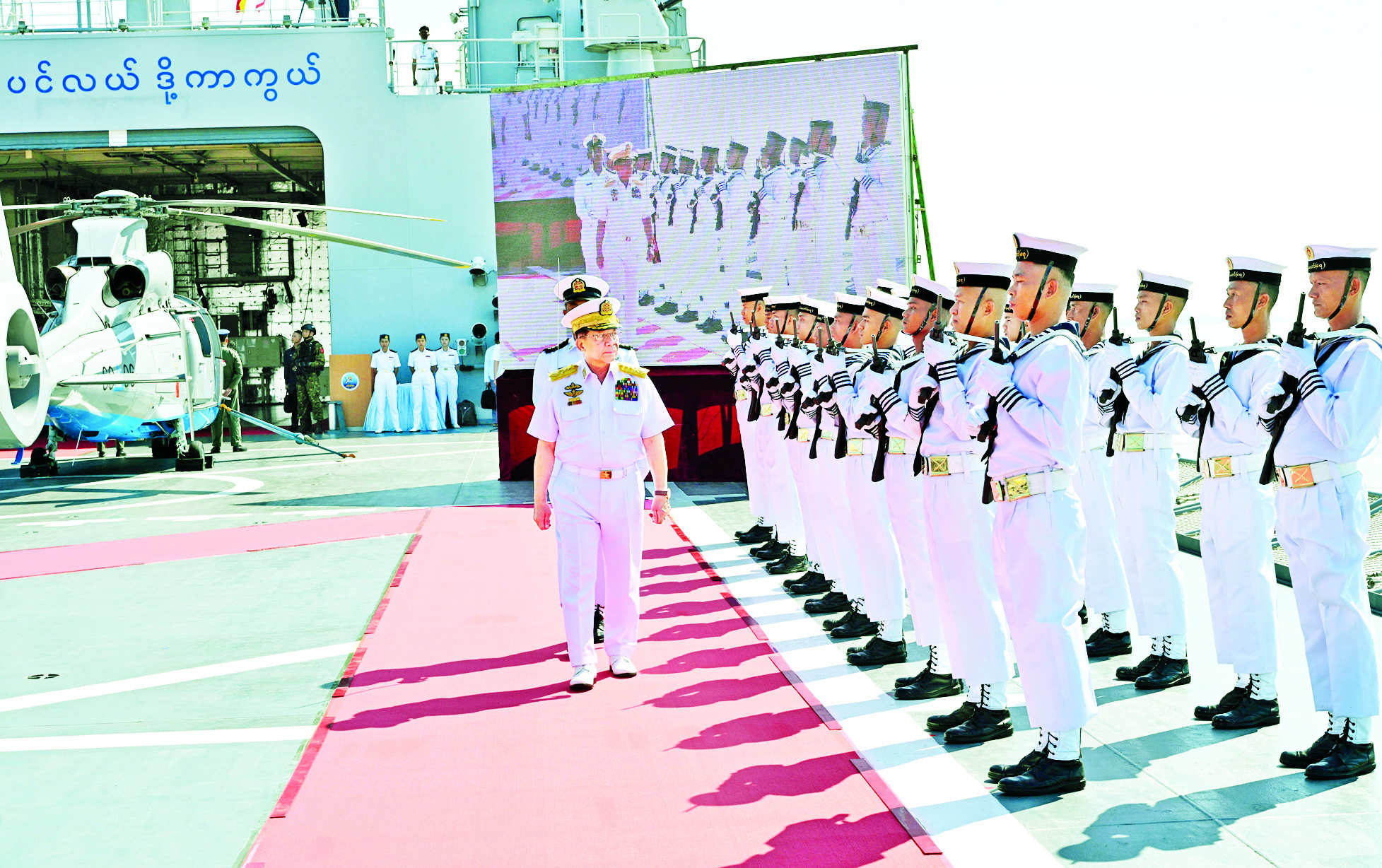 ဂုဏ်ပြုတပ်ဖွဲ့၏ အလေးပြုခြင်းကို ခံယူနေစဉ် စစ်ရေယာဉ် (ရန်တိုင်းအောင်)နှင့် စစ်ရေယာဉ် (ရန်ကြီးအောင်)တို့က အမြောက် ၂၁ ချက်ပစ်ဖောက်ပြီး နိုင်ငံတော် လုံခြုံရေးနှင့် အေးချမ်းသာယာရေး ကော်မရှင်ဥက္ကဋ္ဌ တပ်မတော် ကာကွယ်ရေးဦးစီးချုပ်အား ဂုဏ်ပြု အလေးပြုကြသည်။ ယင်းနောက် နိုင်ငံတော်လုံခြုံရေးနှင့် အေးချမ်းသာယာရေးကော်မရှင် ဥက္ကဋ္ဌ တပ်မတော် ကာကွယ်ရေးဦးစီးချုပ်အား ရေငုပ်သင်္ဘောစစ်ရေယာဉ် (မင်းရဲကျော်ထင်)၊ ဖရီဂိတ်စစ်ရေ ယာဉ်(အောင်ဇေယျ)ဦးဆောင်သော ဖရီဂိတ်စစ်ရေယာဉ် (ကျန်စစ်သား)၊ ဖရီဂိတ်စစ်ရေယာဉ် (ဆင်ဖြူရှင်)၊ ကော်ဗက်စစ်ရေယာဉ် (တပင်ရွှေထီး)၊ ကမ်းလွန် ကင်းလှည့်ရေယာဉ်(အင်းလေး)၊ ရေငုပ်သင်္ဘော တိုက်ဖျက်ရေး ရေယာဉ် (ရန်ငြိမ်းအောင်)နှင့် ရေငုပ်သင်္ဘော တိုက်ဖျက်ရေး ရေယာဉ်(ရန်ရဲအောင်)၊ အမြန်သွား တိုက်ခိုက်ရေးရေယာဉ် (ဒုံးပျံ) စစ်ရေယာဉ်(၄၉၁)၊ အမြန်သွား တိုက်ခိုက်ရေး ရေယာဉ်(ဒုံးပျံ) စစ်ရေယာဉ်(၄၉၂)တို့က Single Line Formation ပုံစံဖြင့် လည်းကောင်း၊ အမြန်သွား တိုက်ခိုက်ရေး ရေယာဉ် စစ်ရေယာဉ် (၅၆၄)၊ (၅၆၆)၊ (၅၅၆)၊ (၅၅၈)၊ ကမ်းခြေစောင့် တိုက်ခိုက်ရေးရေယာဉ် စစ်ရေယာဉ် (၄၂၇)၊ (၄၂၈)၊ အမြန်သွား ကင်းလှည့်ရေယာဉ် စစ်ရေယာဉ်(၂၇၁)၊ (၂၇၂)၊ (၂၇၆)၊ (၂၇၈)တို့က Line Abreast Formation ပုံပြုပုံစံများဖြင့် ပုံပြုမောင်းနှင်ပြီး နိုင်ငံတော် လုံခြုံရေးနှင့် အေးချမ်း သာယာရေး ကော်မရှင်ဥက္ကဋ္ဌ တပ်မတော် ကာကွယ်ရေးဦးစီးချုပ်အား ချီတက်အလေးပြုကြ သည်။