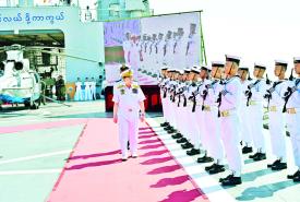 ထို့နောက် နိုင်ငံတော်လုံခြုံရေးနှင့် အေးချမ်းသာယာရေး ကော်မရှင်ဥက္ကဋ္ဌ တပ်မတော် ကာကွယ်ရေး ဦးစီးချုပ်သည် စစ်ရေယာဉ်(မုတ္တမ) ပေါ်ရှိ အလေးပြုခံစင်မြင့်မှနေ၍ ဂုဏ်ပြု တပ်ဖွဲ့၏ အလေးပြုခြင်းကိုခံယူပြီး ဂုဏ်ပြုတပ်ဖွဲ့ကို စစ်ဆေးသည်။