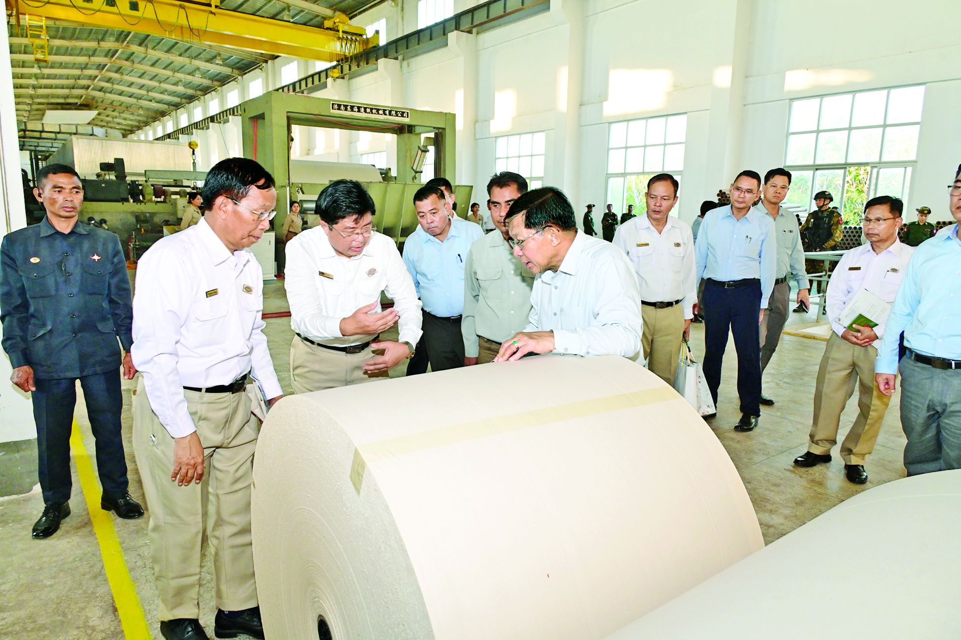 ထို့နောက် နိုင်ငံတော်လုံခြုံရေးနှင့် အေးချမ်းသာယာရေး ကော်မရှင်ဥက္ကဋ္ဌ တပ်မတော် ကာကွယ်ရေး ဦးစီးချုပ်နှင့်အဖွဲ့ဝင်များသည် ဝါးပျော့ဖတ်ထုတ်လုပ်ရေးစက်ရုံ၌ ဝါးကုန်ကြမ်းများအား အဆင့်ဆင့် ကြိတ်ခွဲခြင်း၊ ရေနွေးငွေ့ဖြင့် ပေါင်းခံခြင်း၊ အရောင်ချွတ်ခြင်း လုပ်ငန်းများနှင့် ပျော့ဖတ်ရရှိလာမှု လုပ်ငန်းစဉ် အဆင့်ဆင့်ဆောင်ရွက်နေမှုအခြေ အနေတို့ကိုလည်းကောင်း၊ တန် (၅၀) အဆင့်မြင့် စက္ကူစက်ရုံတွင် အဆင့်မြင့် စက္ကူထုတ်လုပ်မှု လုပ်ငန်းစဉ်အဆင့်ဆင့်နှင့် ထုတ်လုပ်ထားသည့် အဆင့်မြင့်စက္ကူများကိုလည်းကောင်း၊ တန်(၆၀)သတင်းစာ စက္ကူစက်ရုံတွင် သတင်းစာစက္ကူ ထုတ်လုပ်နေမှု လုပ်ငန်းစဉ်အဆင့်ဆင့်ကိုလည်းကောင်း၊ စွမ်းအင်လောင်စာတောင့် စက်ရုံတွင် လောင်စာတောင့် ထုတ်လုပ်နေမှု အဆင့်ဆင့်ကိုလည်းကောင်း စက်ရုံတစ်ခုချင်းစီအလိုက် လိုက်လံကြည့်ရှု စစ်ဆေးပြီး တာဝန်ရှိသူများ၏ တင်ပြချက်များအပေါ် လိုအပ်သည်များ လမ်းညွှန်မှာကြားခဲ့ကြောင်း သိရသည်။