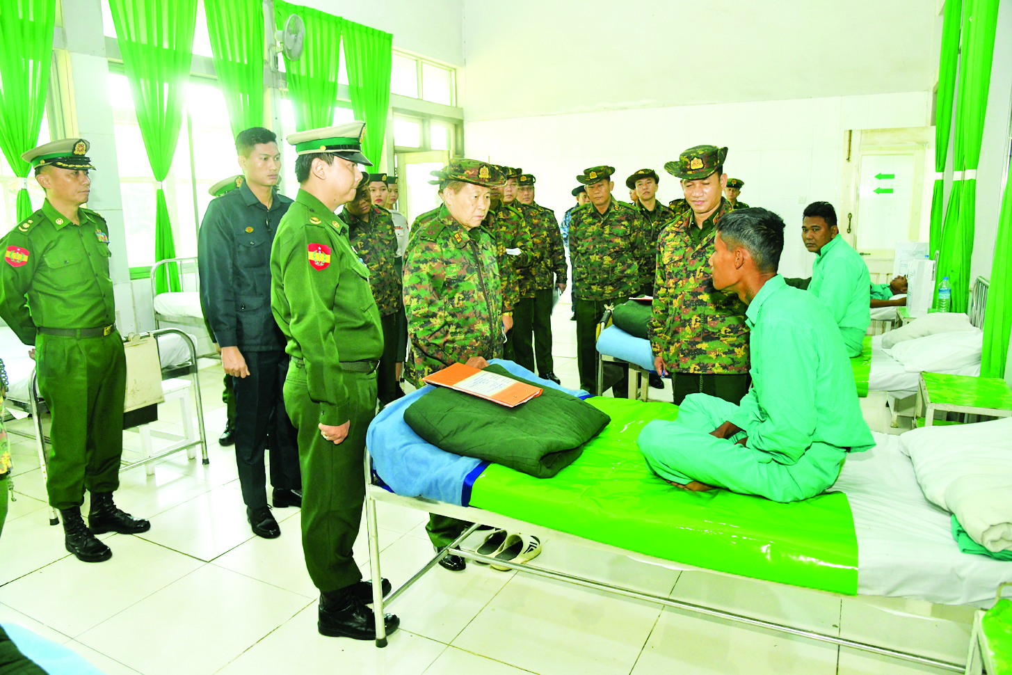 ထို့နောက် နိုင်ငံတော် လုံခြုံရေးနှင့် အေးချမ်းသာယာရေး ကော်မရှင်ဒုတိယဥက္ကဋ္ဌ ဒုတိယ တပ်မတော်ကာကွယ်ရေးဦးစီးချုပ် ကာကွယ်ရေးဦးစီးချုပ် (ကြည်း)နှင့် အဖွဲ့ဝင်များသည် ဆေးရုံတွင် တက်ရောက် ဆေးကုသမှုခံယူလျက်ရှိသည့် အရာရှိ၊ စစ်သည်၊ ပြည်သူ့စစ်(ဌာနေ) တပ်ဖွဲ့ဝင်များကို တစ်ဦးချင်းလိုက်လံ ကြည့်ရှု၍ ဒဏ်ရာရရှိမှု၊ ရောဂါဖြစ်ပွားမှုအခြေအနေများ၊ ဆေးဝါးကုသပေးထားမှု အခြေအနေများနှင့် ကျန်းမာရေးတိုးတက်ကောင်းမွန်လာမှု အခြေအနေများကို ရင်းရင်းနှီးနှီး လိုက်လံမေးမြန်း အားပေးစကားပြောကြားပြီး စားသောက်ဖွယ်ရာများနှင့် ဂုဏ်ပြုချီးမြှင့်ငွေများ ပေးအပ်သည်။