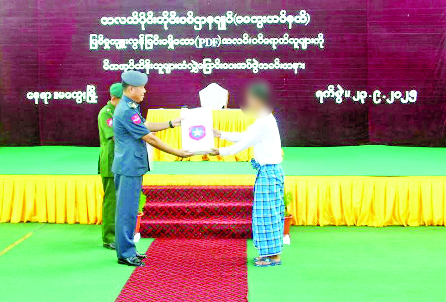 နိုင်ငံတော်အစိုးရသည် PDF အပါအဝင် အဖွဲ့အစည်းအမျိုးမျိုးအမည်ခံ၍ လက်နက်ကိုင်ဆန့်ကျင် လျက်ရှိသည့် အဖွဲ့အစည်းများအတွင်း ရောက်ရှိနေသူများအား ဥပဒေဘောင်အတွင်းသို့ ပြန်လည်ဝင်ရောက်ရန် ဖိတ်ခေါ်၍ ဥပဒေဘောင်အတွင်းသို့ ပြန်လည်ဝင်ရောက်လာကြသူများကိုလည်း လိုအပ်သည့် ကူညီပံ့ပိုးမှုများ ဆောင်ရွက်ပေးလျက်ရှိရာ နိုင်ငံတော်နှင့် တပ်မတော်၏ ငြိမ်းချမ်းရေးလုပ်ငန်းစဉ်များကို နားလည်သဘောပေါက်လာသည့် PDF အမည်ခံအဖွဲ့မှ အဖွဲ့ဝင်ငါးဦးသည် ယနေ့တွင် ဥပဒေဘောင်အတွင်းသို့ ထပ်မံဝင်ရောက်လာကြသည်။