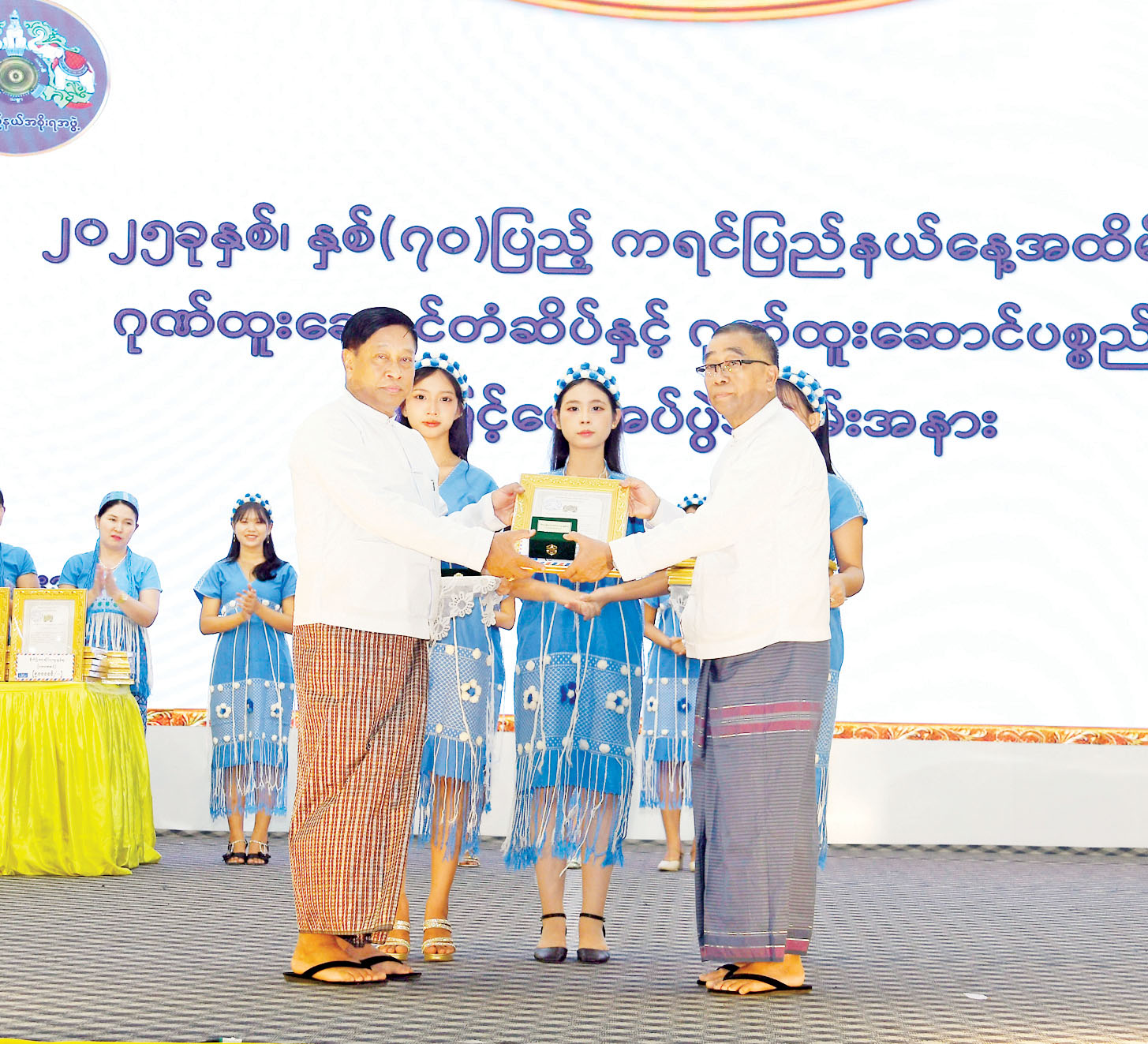 ထို့နောက် ပြည်ထောင်စုဝန်ကြီးနှင့် အဖွဲ့ဝင်များသည် ဘင်ခရာ၊ ပန်းဖွားနှင့် ဒုံးအဖွဲ့များကို ဂုဏ်ပြုချီးမြှင့်ငွေများ ပေးအပ်ပြီး စုပေါင်းမှတ်တမ်းတင် ဓာတ်ပုံရိုက်ကြကာ နှစ် (၇၀) ပြည့် ကရင်ပြည်နယ်နေ့အထိမ်းအမှတ်အဖြစ် ခင်းကျင်းပြသထားသည့် ဌာနဆိုင်ရာပြခန်းများ၊ တိုင်းရင်းသားရိုးရာယဉ်ကျေးမှုပြခန်းများ၊ ဒေသထွက်ကုန် အရောင်းပြခန်းများ၊ အသေးစား၊ အငယ်စား၊ အလတ်စား (MSME) စက်မှုလက်မှုထုတ်ကုန်ပြခန်းများကို လှည့်လည်ကြည့်ရှု အားပေးကြသည်။