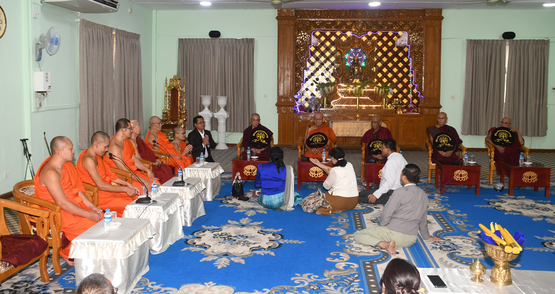 နိုင်ငံတော်သံဃမဟာနာယကအဖွဲ့ အကျိုးတော်ဆောင်  အဂ္ဂမဟာပဏ္ဍိတ အဂ္ဂမဟာသဒ္ဓမ္မ ဇောတိကဓဇ သန်လျင်မင်းကျောင်းဆရာတော် ဒေါက်တာဘဒ္ဒန္တစန္ဒိမာဘိဝံသ အမှူးပြုသော နိုင်ငံတော် သံဃမဟာနာယက ဆရာတော်ကြီး ၄ ပါးနှင့် နေပြည်တော် ဒက္ခိဏသီရိ မြို့နယ်၌ တည်ထားကိုး ကွယ်လျက်ရှိသော မာရဝိဇယ ဗုဒ္ဓရုပ်ပွားတော်မြတ်ကြီး ဗုဒ္ဓါဘိသေက အနေ ကဇာတင်ပွဲသို့ ကြွရောက်တော်မူလာကြသည့် လာအိုနိုင်ငံ သံဃရာဇာဆရာတော်ကြီး အဘိဓဇအဂ္ဂမဟာ သဒ္ဓမ္မဇောတိက Most Ven . Bounma Simmaphom နှင့်အဖွဲ့တို့ တွေ့ဆုံပွဲ အခမ်းအနားကို ယနေ့ မွန်းလွဲ (၂) နာရီတွင် ရန်ကုန်တိုင်းဒေသကြီး မရမ်းကုန်းမြို့နယ် ကမ္ဘာအေးကုန်းမြေ၊ မဟာနာယကကျောင်းဆောင် ဘုရားခန်းမ၌ ကျင်းပသည်။