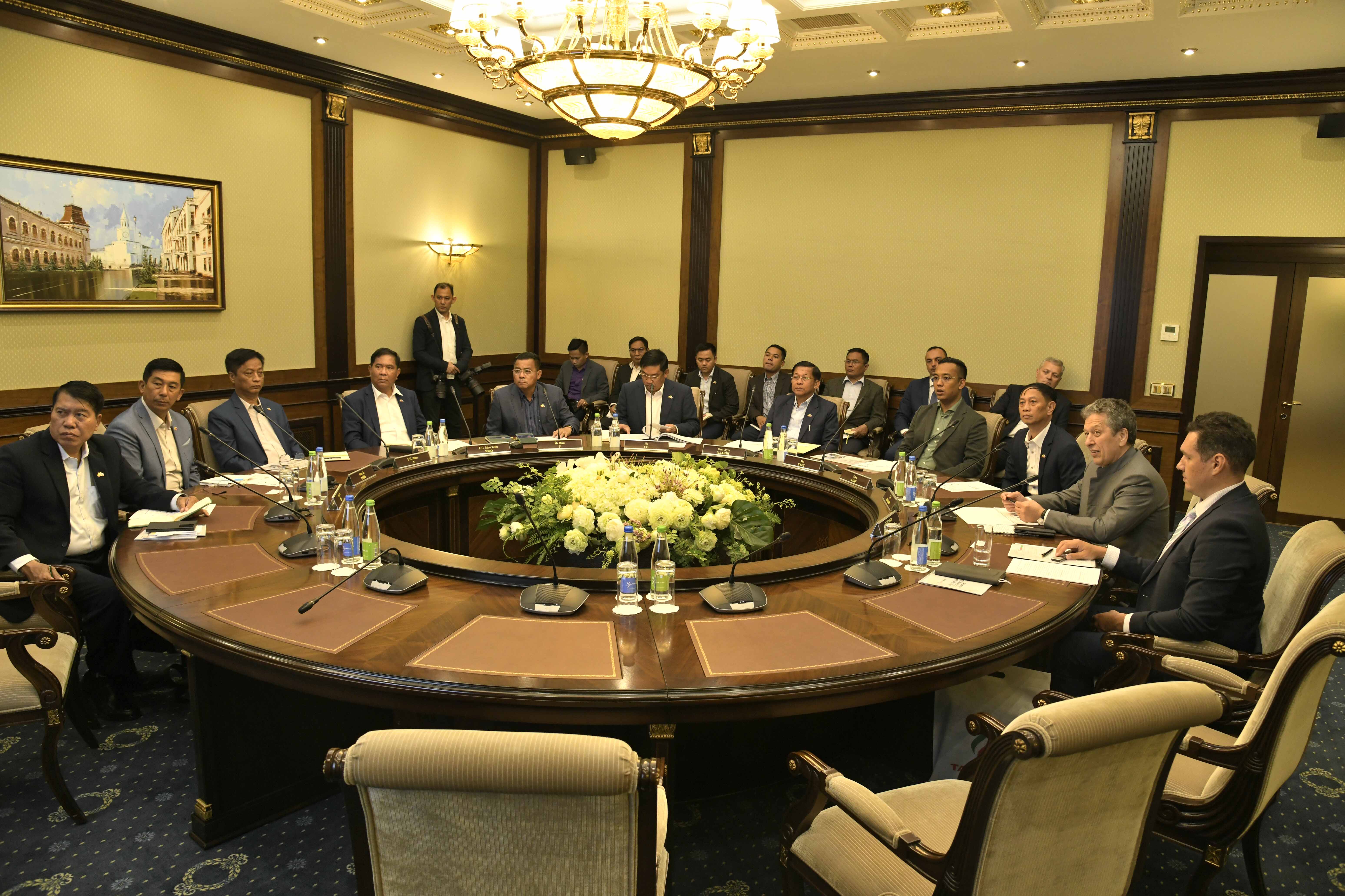 ရှင်းလင်းတင်ပြမှုများနှင့် ပတ်သက်၍ နိုင်ငံတော်စီမံအုပ်ချုပ်ရေးကောင်စီဥက္ကဋ္ဌ၊ နိုင်ငံတော်ဝန်ကြီးချုပ် နှင့် ကိုယ်စားလှယ်အဖွဲ့ဝင်များက မြန်မာနိုင်ငံ၏ လောင်စာဆီလိုအပ်ချက်နှင့် ဖြည့်ဆည်းဆောင်ရွက် နိုင်ရေး စီမံဆောင်ရွက်လျက်ရှိသည့် အခြေအနေများ၊ “Tatneft”ကုမ္ပဏီနှင့် ပူးပေါင်းဆောင်ရွက်မှုများ လုပ်ဆောင်နိုင်မည့် အခြေအနေများ၊ ရေနံနှင့် သဘာဝဓာတ်ငွေ့ကို အခြေခံသည့် ရင်းနှီးမြှုပ်နှံမှုဆိုင်ရာ လုပ်ငန်းများကို ရေရှည်ပူးပေါင်းဆောင်ရွက်နိုင်မည့် အခြေအနေများနှင့်ပတ်သက်၍ ပြန်လည် ဆွေးနွေးပြောကြားသည်။