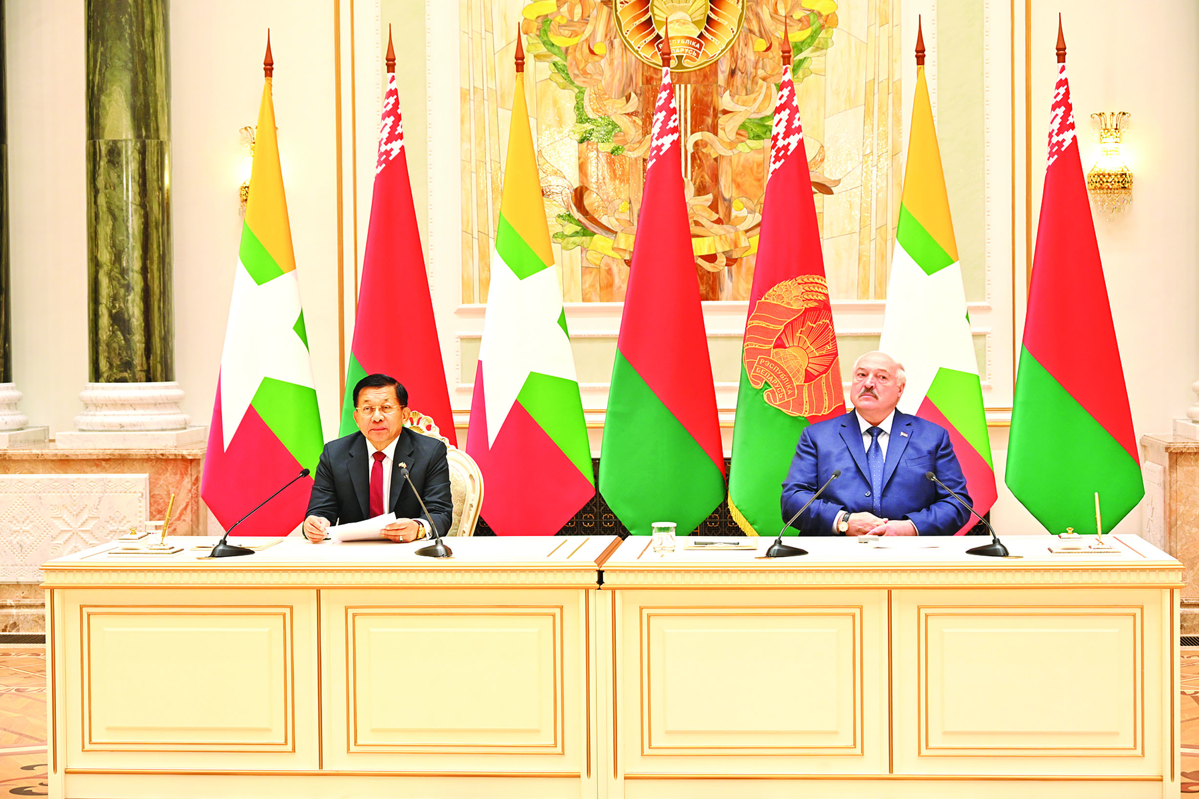 နိုင်ငံတော်စီမံအုပ်ချုပ်ရေးကောင်စီဥက္ကဋ္ဌ နိုင်ငံတော်ဝန်ကြီးချုပ် ဗိုလ်ချုပ်မှူးကြီး မင်းအောင်လှိုင်နှင့် ဘယ်လာရုစ်သမ္မတနိုင်ငံ သမ္မတ H.E. Mr. Alexander Gregoryevich Lukashenko တို့ မီဒီယာများနှင့်တွေ့ဆုံစဉ် နှစ်နိုင်ငံ အပြန်အလှန်ပူးတွဲကြေညာချက်များနှင့် ပြောကြားချက်များ