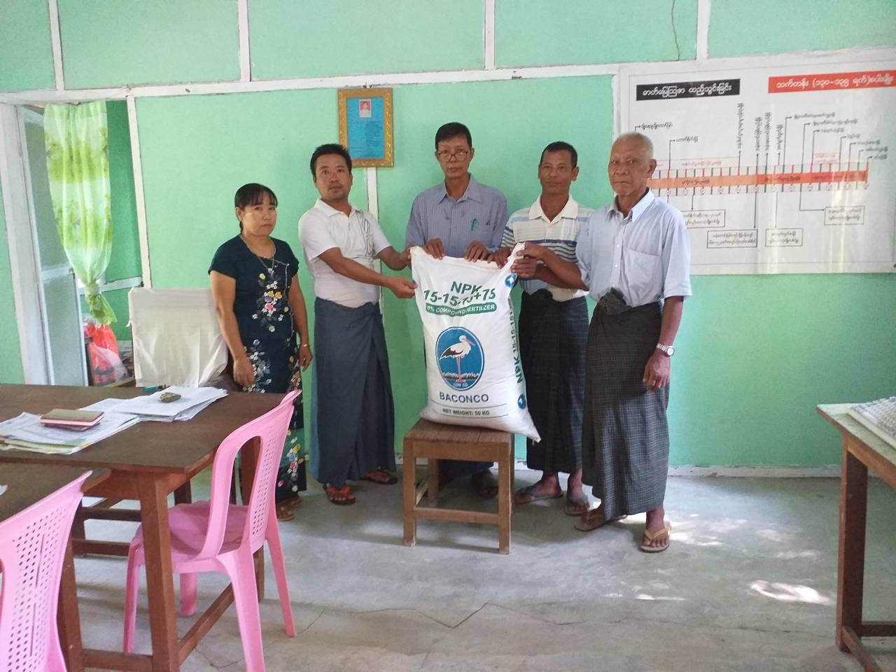 ထိုသို့ဖြန့်ဝေရာတွင် မျိုးစေ့ထုတ်ကွက်၊ စမ်းသပ်ကွတ်နှင့် စံပြစိုက်ကွတ်တောင်သူ ၅၅ ဦးအတွက် မြေသြဇာ ၁၂၂ အိတ်ပေးအပ်သည့်အပြင် တစ်တန်ဝင်လေလုံ မျိုးစိတ်အိတ်များကို တောင်သူခုနစ်ဦး အတွက် ခုနစ်အိတ်၊ စံပြစိုက်ကွက်စိုက်တောင်သူ ၁၅ ဦးအတွက် မိုးကာစ ၁၅ ခုတို့ကိုပေးအပ်ခဲ့သည်။